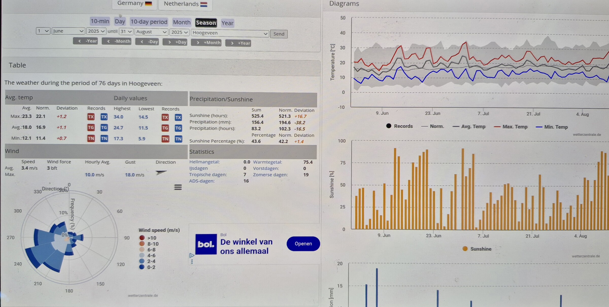 Hier een normale zomer, niets bijzonders. De week was mooi, volgende week afwachten, maar dalende trend is ingezet. Wordt wennen...