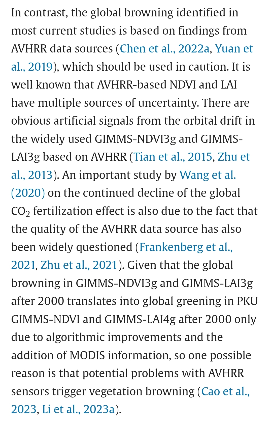 De Chen et al (2024) uit het DOE rapport geeft prima aan waarom je Chen et al (2022) die gesuggereerd wordt prima weg kan laten. De 90% oppervlak dat browning vertoond verdwijnt grotendeels als je de gebruikte dataset update van versie 3 naar 4. Die laatste past onder andere een correctie toe om te corrigeren voor de drift van de satelietten met de AVHRR sensor: