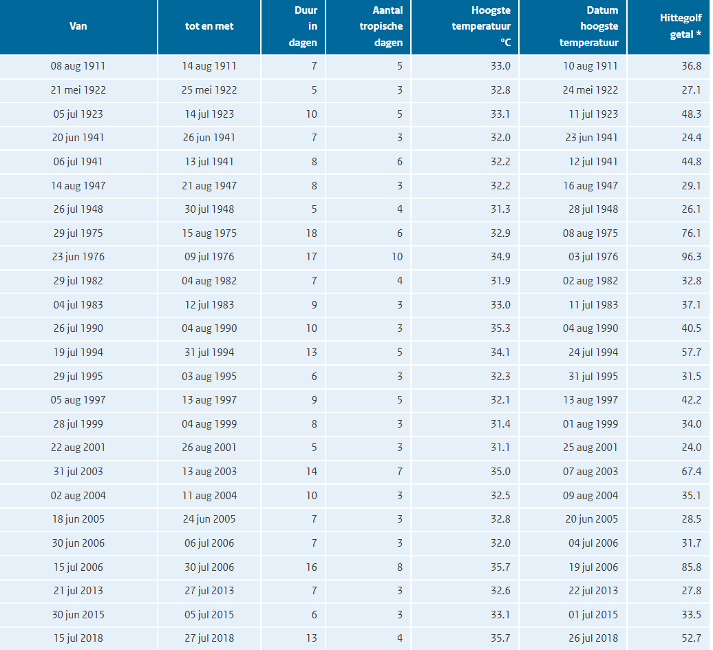 De hittegolf van 1976 blijft eenzaam bovenaan met een hittegolfgetal van 96,3. Je zou kunnen zeggen dat de twee landelijke hittegolven van dit jaar weinig voorstellen met respectievelijk 26,8 en 24,7.