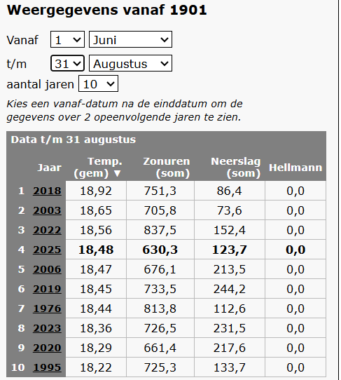 Trek je dit door naar de zomertemperatuur dan komen we uit op een vierde plek achter 2018, 2003 en 2022. En maar nipt boven de zomers van 2006, 2019 en 1976.