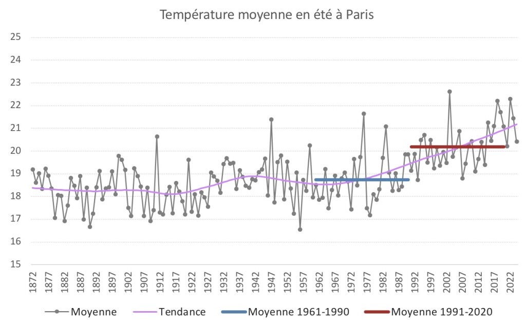 Parijs zit anno 2024/25 qua trendwaarde voor de gemiddelde zomertemperatuur al op 21,1°C en dat is 2,4°C warmer dan in 1961-1990 (18,7°C). Dit op basis van de gevestigde Loess-methode van het KNMI. Voor wat betreft de gemiddelde maximumtemperatuur zijn de Parijse zomers maar liefst 3,1°C opgewarmd ten opzichte van 1961-1990. In de kernzomer is een maximumtemperatuur van 27°C inmiddels vrij normaal.