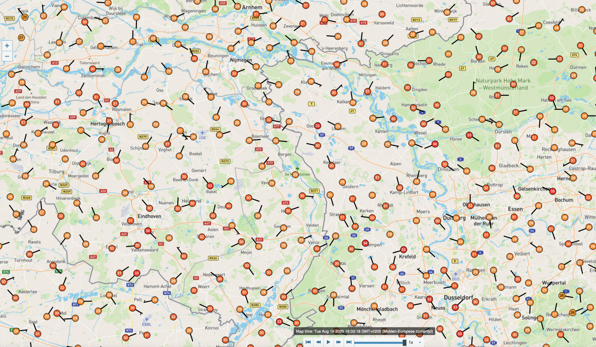 Overal (in stedelijke gebieden) in ZO-nederland en W-Duitsland zitten de temperaturen nu rond de 30: