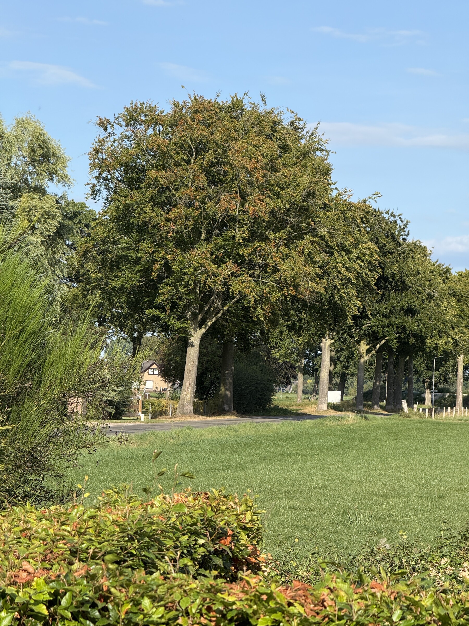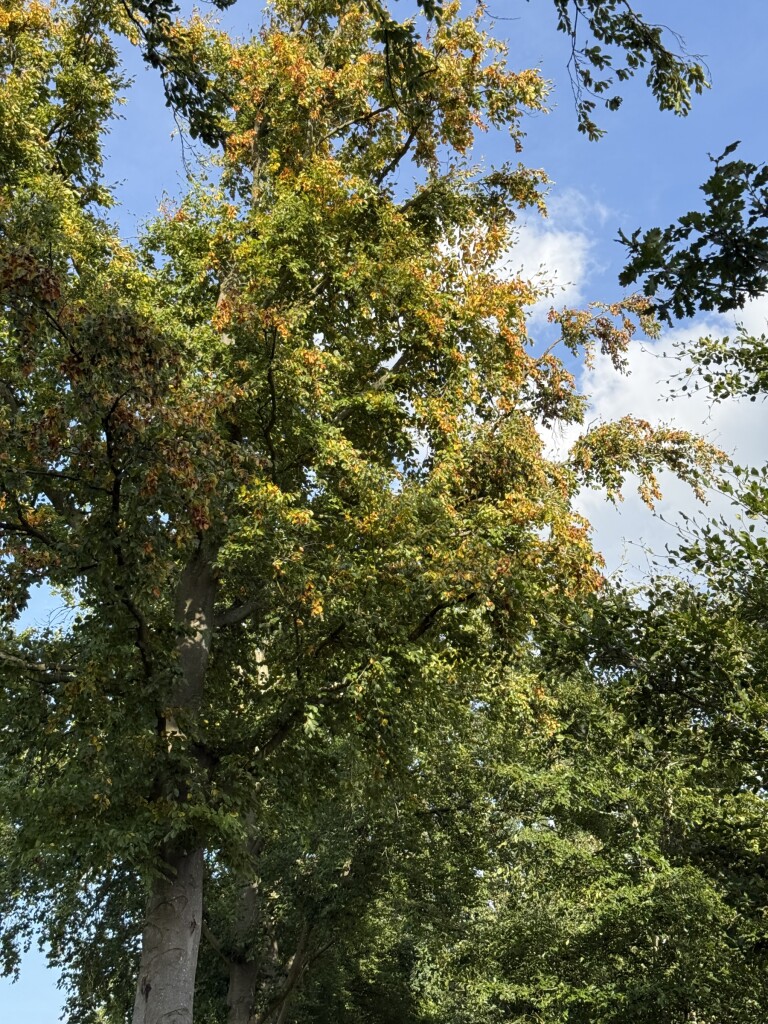 De droogte is dit jaar minder opvallend, doordat er met enige regelmaat toch wat regen viel. Daardoor is het gras niet overal bruin, en hebben de planten in de tuinen de zomer prima doorstaan. Maar van die kleine neerslaghoeveelheden bereikt maar weinig de zone waar bijvoorbeeld de beuken hun vocht vandaan halen, op wat grotere diepte in de bodem.