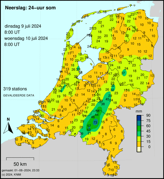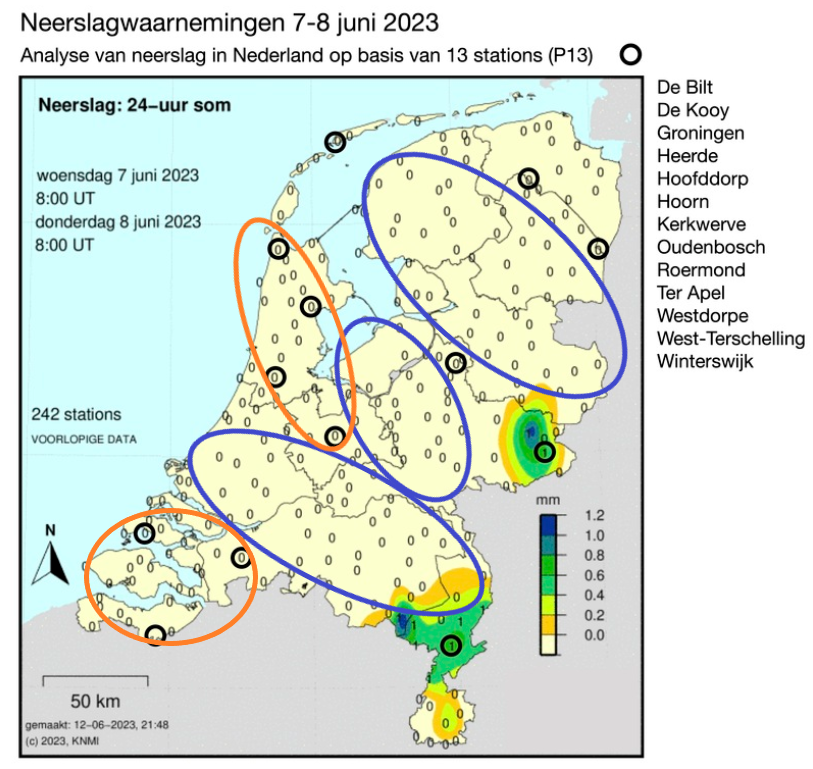 Blauw omlijnd zijn de grote gebieden waarvan neerslag niet meegewogen wordt in het gemiddelde van de P13.