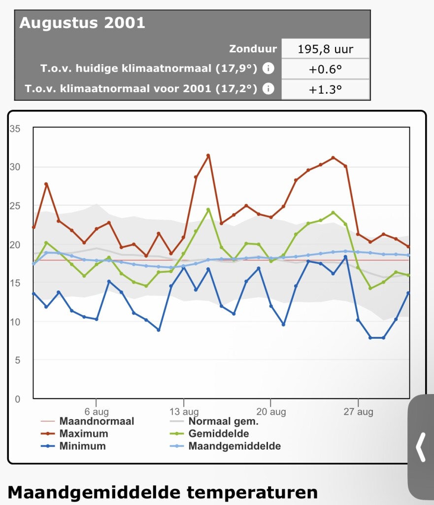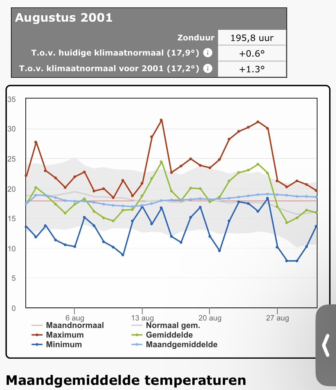 Je kunt aan het gemiddelde goed zien dat die laatste week vaak al duidelijk koeler is. Zelfs in toppers als 1995, 2018 en 2023 goed te zien.