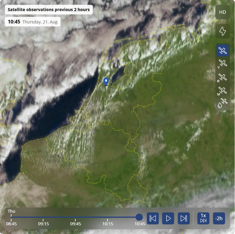 De satelliet laat ook best een aardig beeld zien, met wolkenstraten in het westen, een nog meer convectieve band (TCu?) over het noorden en stratus noord daarvan.