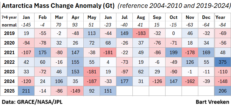 Het is ook interessant om te kijken naar de anomalie van de massaverandering per maand. Het 'normale'patroon op Antarctica is veel rommeliger dan op Groenland. Het meeste massaverlies is in de Antarctische zomer, en de meeste aanwas is na het invallen van de Antarctische winter. Maar ook midden in de Antarctische winter (juni, juli) zijn er maanden waarin er meestal massaverlies is. Augustus en september zijn dan weer wat gunstiger. Het is me niet duidelijk hoe dit patroon tot stand komt.