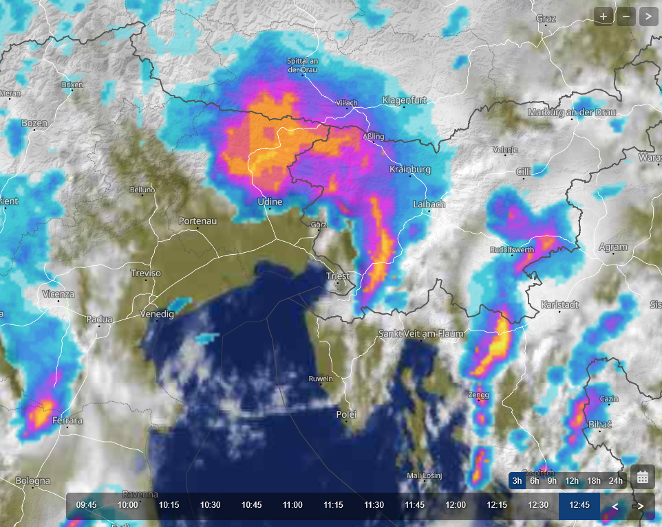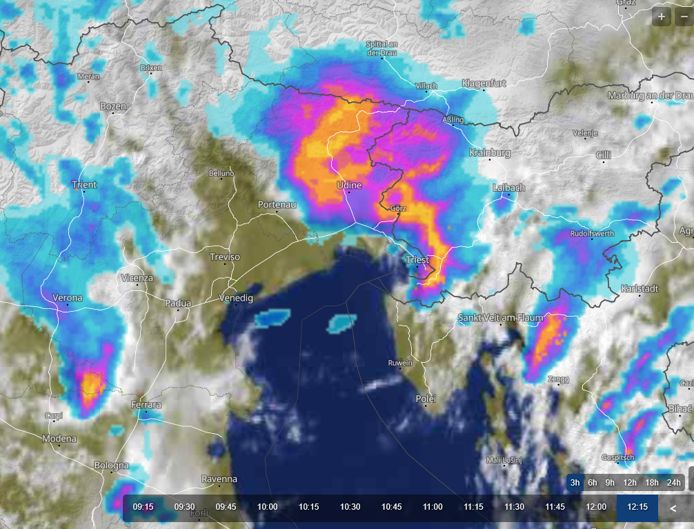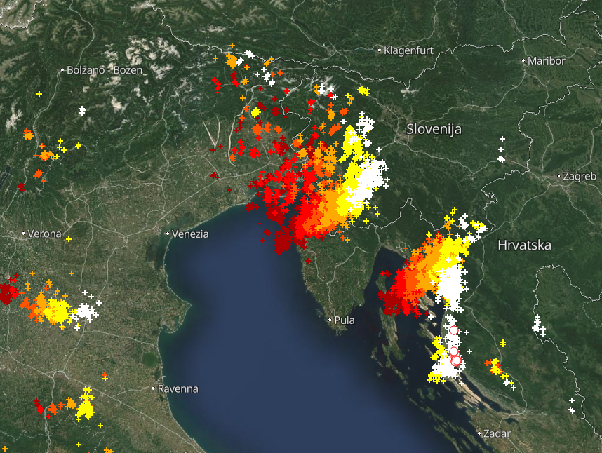Op het gecombineerde neerslagbeeld ziet het er op dit moment nogal heftig uit aan de noordoostrand van Italie, en ten oosten daarvan, met een heel groot buiencomplex waar de neerslagintensiteit in een groot gebied erg hoog ligt. Het kan een MCS zijn? Ook is er in een deel hiervan een flinke onweersactiviteit. Die krul onderaan ziet er bovendien verdacht uit. Dit kan mogelijk tot ongelukken leiden. In elk geval zullen velen er min of meer door verrast worden, waaronder ook toeristen.