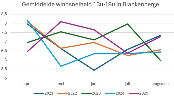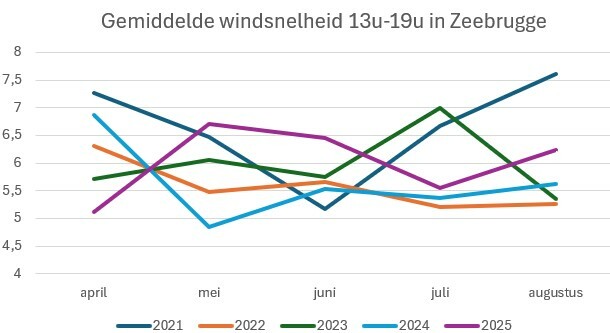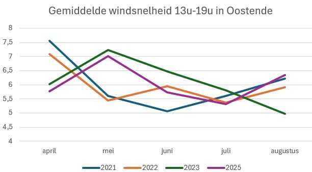 Snel eens de berekeningen voor het tijdvak 13u-19u gedaan. Overdag ligt de windsnelheid logischerwijs hoger, maar de windsnelheden in de namiddag liggen dit jaar in dezelfde lijn als de voorbije jaren.