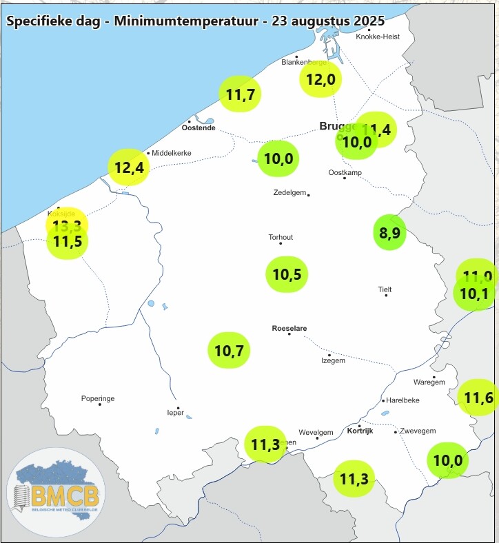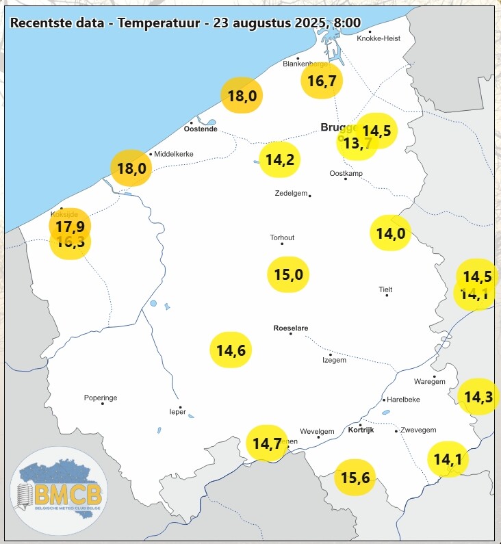Goedemorgen, kaart minima en temperaturen 8u00. Jabbeke 14,2°C Tn 10°C