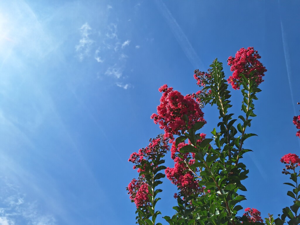 De lagerstroemia Tuscarora staat ook top nu, op naar een boom van 5 a 7m. Kleur koraalroze maar heel moeilijk juist te krijgen op foto dus vaker roder.