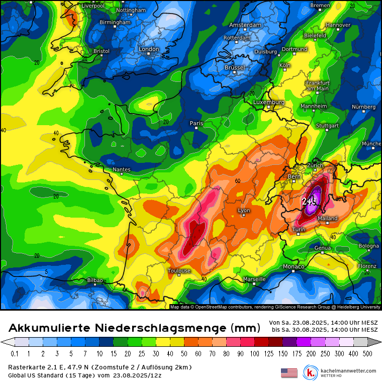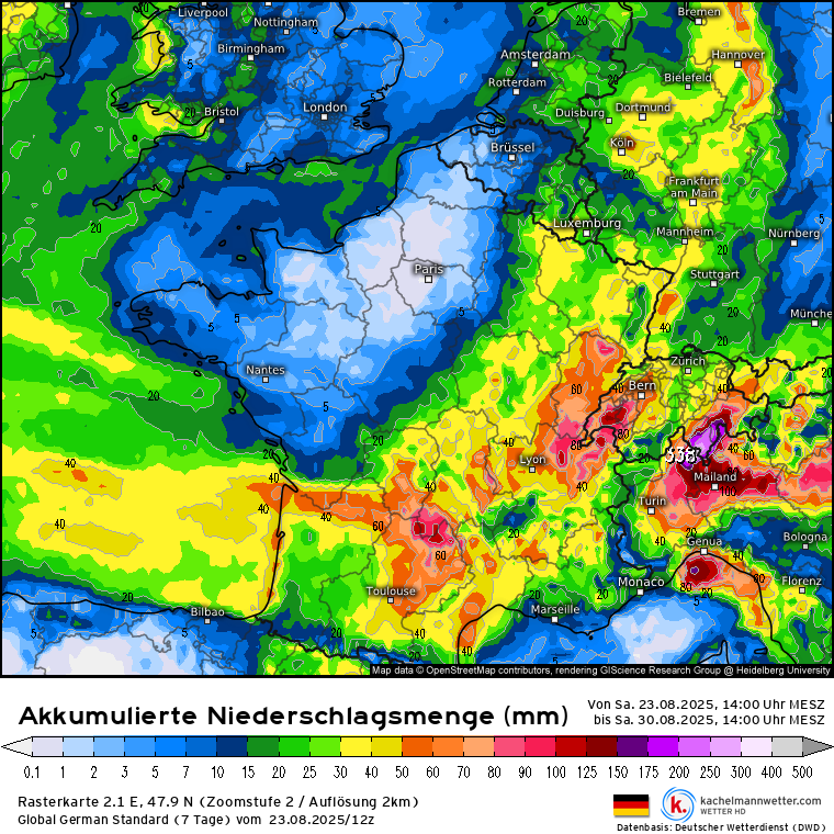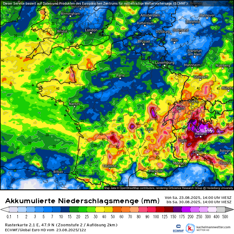 Met de komst van de restanten van Erin nemen de neerslagkansen in west Europa de komende week toe. Uiteraard is dit niet overal gelijk verdeeld. Voor de Benelux is het nog maar de vraag of er veel gaat vallen, omdat de grootste neerslaghoeveelheden zowel ten westen als ten zuidoosten ervan plaats zouden gaan vinden. Hieronder de berekende neerslagtotalen tot over een week van EC, ICON en GFS van de 12Z-runs. In elke geval is Frank net op tijd weg uit noord Italie, want in die regio (inclusief het zuiden van Zwitserland) wordt tot ongeveer 300 mm verwacht.