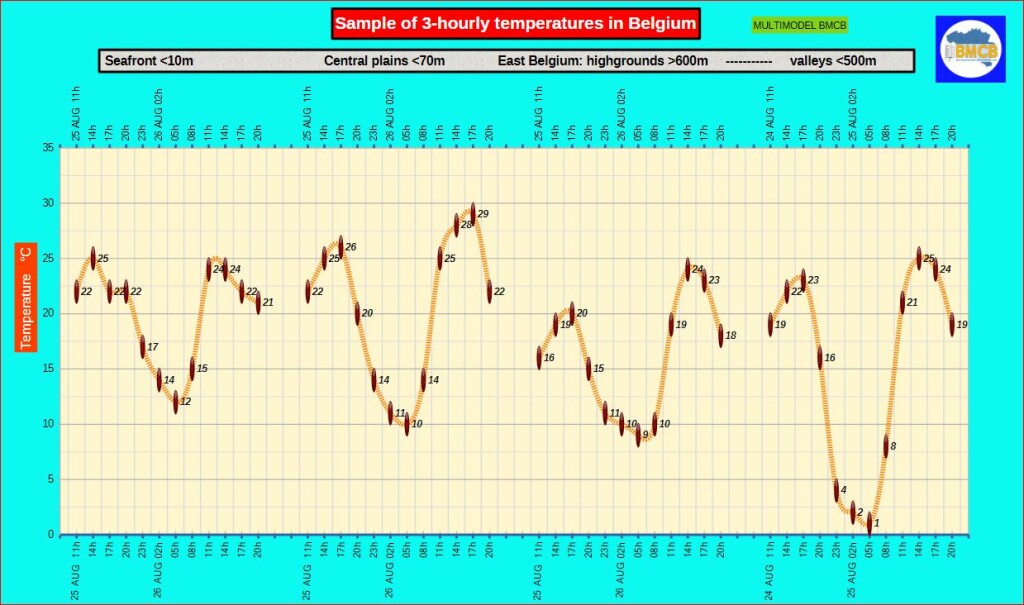 Minima : 12/14°C aan de kust, 10/15°C in het binnenland, 9/12°C ten zuiden van Samber-Maas, lokaal 1–8°C in de valleien.