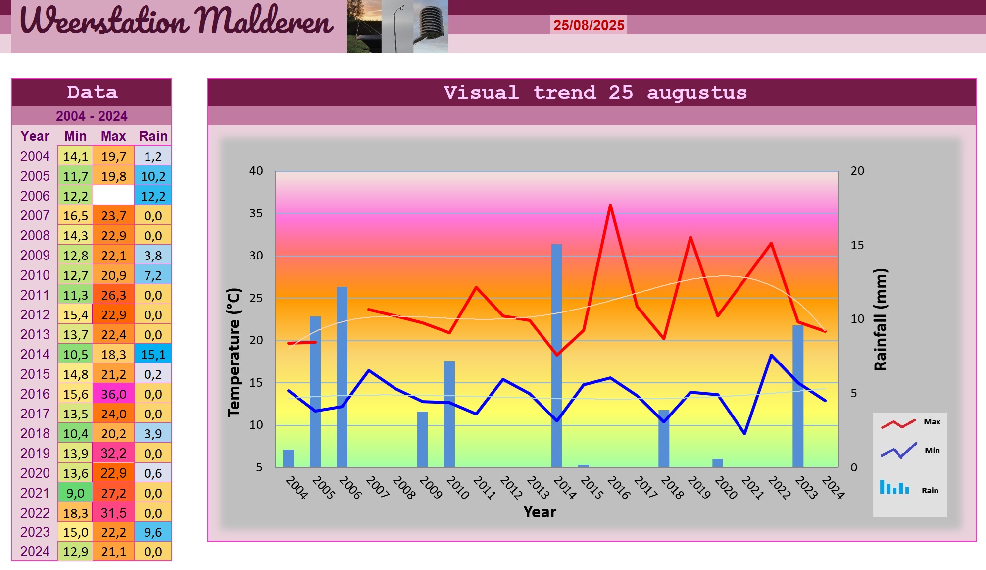 We begonnen de dag in zwaarbewolkte omstandigheden met vooral Stratocumulusbewolking bij minima van 13,7 graden. Na een tijdje vielen daar gaten in en kregen we weer mooie opklaringen te zien met een flinke portie zonneschijn erbij. Er werden stapelwolken gevormd al slaagden ze er niet in om uit te groeien tot buien. Vooral rond en kort na de middag werd het aangenaam zomerweer bij temperaturen die naar 22,4 graden stegen en een zwak westelijk briesje dat geleidelijk overging in een oostelijke tot noordoostelijke stroming. Toen kwam er echter sluierbewolking binnentrekken en werd er ook Stratocumulus castellanus gevormd die aangaf dat we in een onstabielere luchtmassa terechtkwamen. Het voelde ook zo aan want het werd nu een beetje drukkend terwijl de zon flink ging 'steken' terwijl er gisteren en vanochtend nog een verkoelende wind stond die duidelijk van polaire oorsprong was. Nu stond er weer een zuidoostelijke tot oostelijke wind die warme lucht aanvoerde. Een blik op de analysekaarten leerde ons dat de warme lucht vanuit het noordoosten weer geleidelijk ons land begint binnen te stromen en dat de bewolking gedeeltelijk afkomstig is uit een warmtefront. Op het einde van de namiddag ging het dan weer druppelen uit een wolkenmassa die er veel dreigender uitzag dan ze was, en net als gisteren ging het weer om een net wel / net niet regenvlaag die het een hele tijd liet druppelen aan een intensiteit van 30 tot 40 druppels per vierkante meter per minuut. Veel saaier dan de onweersbuien die ze wat verderop in Nederland voor de kiezen kregen waar men zich verder in de onstabiele lucht bevond en er bovendien nog opklaringen waren die het genoeg lieten opwarmen om de onweersbuien te voeden. Toch zorgde de setting in Malderen voor een aparte sfeer en door het ontbreken van wind en het vasthouden van de warmte door de bewolking was het zelfs nog mogelijk om een groot deel van de late avond op een terrasje door te brengen. Zoals wel enigszins kon verwacht worden sloten we deze dag af met een neerslagtotaal van 0,0 mm.