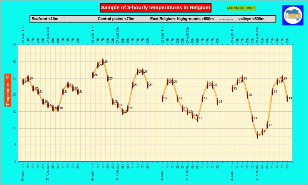 Maxima: 25–27 °C aan de kust, 27–30 °C in het binnenland, 24–25 °C in de Ardennen.