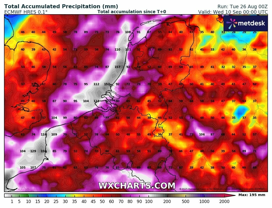 150 mm is best fors, al is het boven zee. Doet aan vorig jaar september denken. Toen rond de 10e ook zulke extreme verwachtingen.
