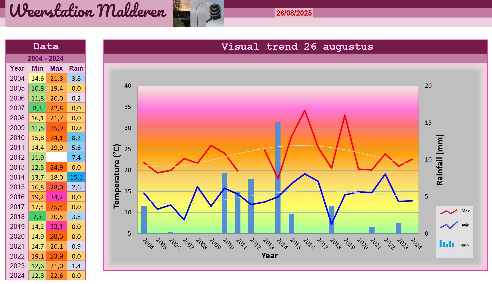 Het zag er vanochtend niet erg sfeervol uit met een paar Stratus fractus wolkjes, dikke aaneengesloten velden Stratocumulus en een bovenlaag van Altostratus. Wie in staat was om er zelf de zon bij te fantaseren, had echter weinig klagen bij temperaturen die omstreeks 6H 17,8 graden bedroegen en het droge weer. Tot de regen kwam tenminste, en deze bereikte ons nog voor 10H in de vorm van regen en motregen. Deze werd door Stratus en Nimbostratusbewolking in Malderen geloosd, een proces dat zowat de ganse dag aanhield. Soms waren er wat drogere momenten, maar de zon kregen we vrijwel niet te zien zodat we het vooral moesten hebben van de erg hoge temperaturen die 24,1 graden haalden. Hoewel het de hele dag door erg regenachtig was, bleven de zwaarste regengebieden net ten noorden van ons waar een koufront in haar lengte voorbijtrok. Ten noorden van dat front waren de luchtmassa's een stuk frisser en werd er met moeite slechts 14 graden gehaald. Tijdens de avond kwam het front iets dichterbij waardoor de neerslag wat intenser werd, maar met een dagsom van 8,2 mm bleven we ver achter op onze Nederlandse buren die soms meer dan 100 mm konden optekenen. Een ander weerselement dat niet onopgemerkt voorbijging was de wind die met haar snelheden tot 35,4 km/h uit het zuidwesten duidelijk in topconditie was. Deze bleef ook 's avonds aanhouden waardoor het ondanks de zachte temperaturen eerder aan herfst deed denken. De uiteindelijke minima bedroegen 15,8 graden.