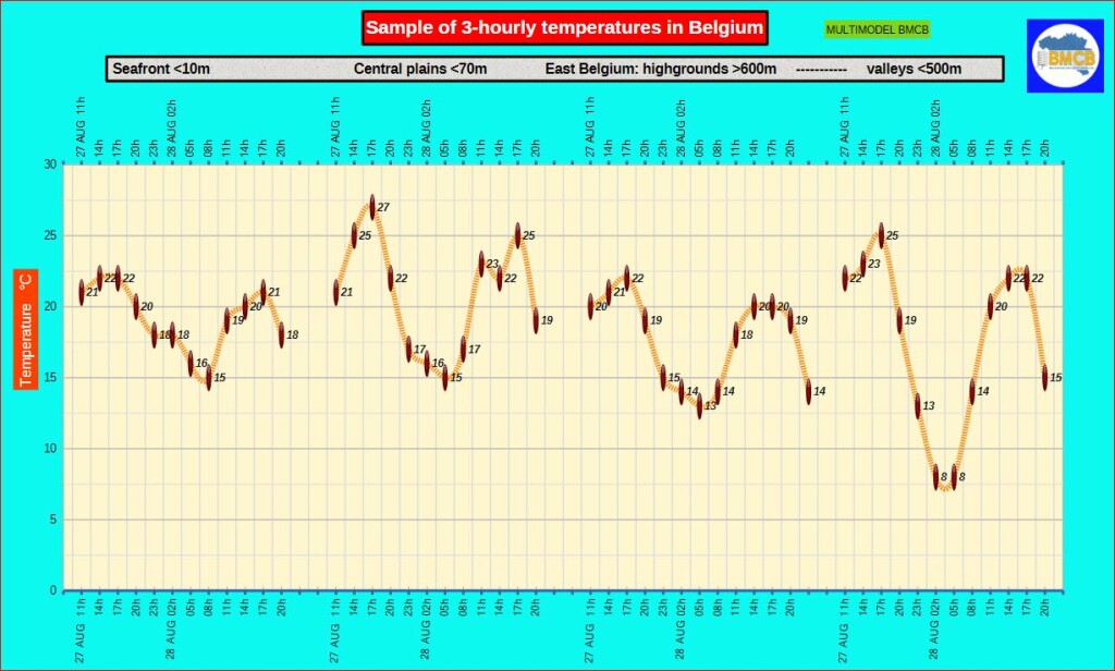 Minima: 14/16 °C aan de kust, 15/18 °C binnenland, 13/16 °C zuid Samber-Maas, 8/13 °C in valleien