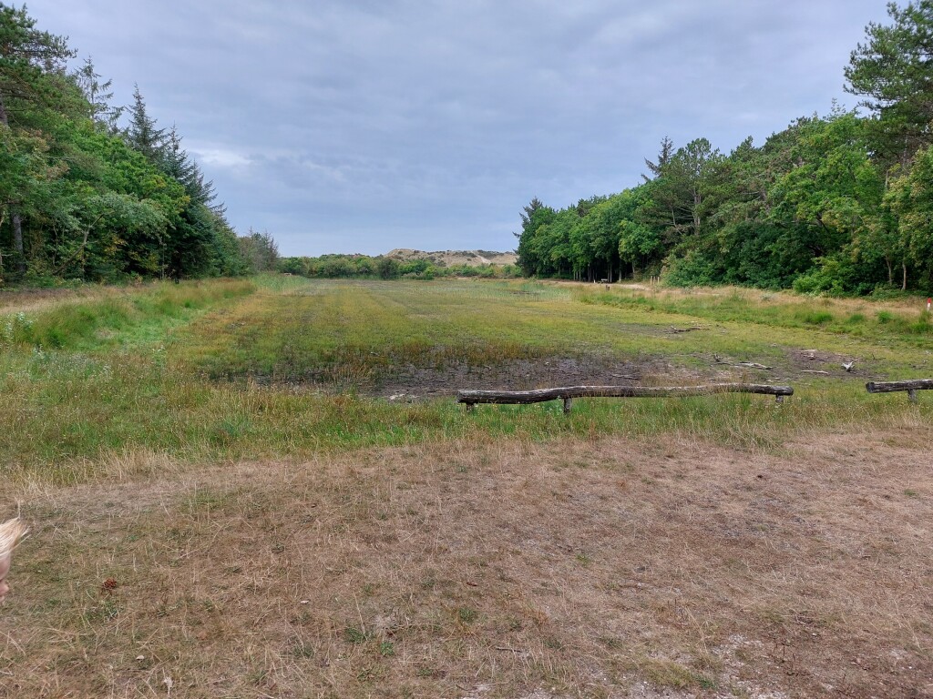 Vooral in de bebouwde kom is het gras overal al geel en soms zelfs helemaal verdwenen, maar ook buiten de bebouwde kom zijn droogteperikelen waarneembaar. Zo ook het droogliggende meertje Hêdredersplak op de foto hieronder waar we vanochtend een kabouterpad met de kids gelopen hebben.