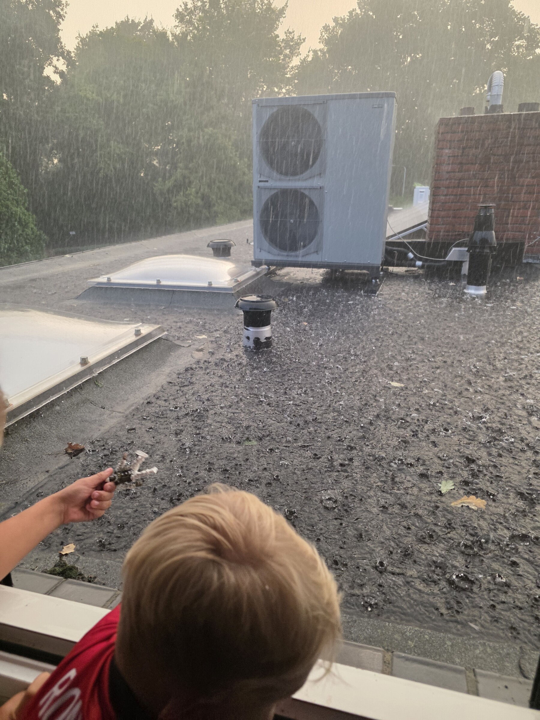 Het hing boven Lomm en nog meer boven Lottum en het ging even goed te keer. 18 mm hier gevallen in slechts minuten tijd. Mijn kinderen konden het wel appreciëren