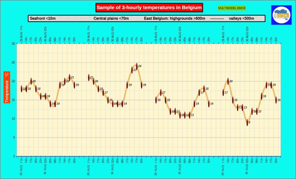 Minima: 13/15°C aan de kust, 14/15°C binnenland, 11/13°C ten zuiden van Samber-Maas, 9/11°C in valleien.