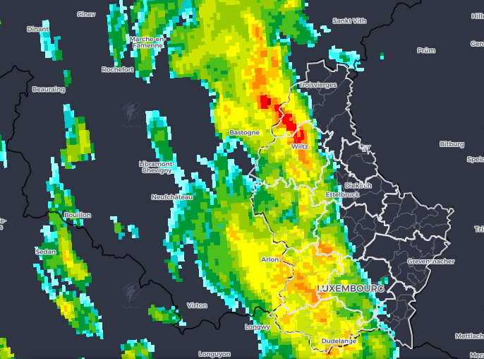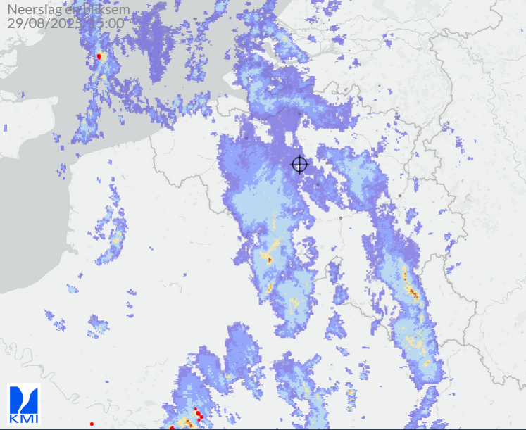 Die zie ik niet op de beelden van het KMI. Wel om 15:00 een flinke bui verder richting Engeland, met een paar ontladingen erin. En de volgende buienlijn komt nu hier bij mij aan.