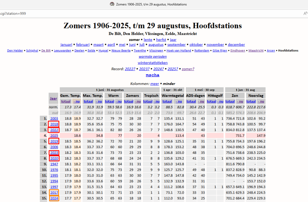 Zowel thermisch als op het gebied van zonneschijnduur. Met neerslag binnen hetzelfde tijdvak sinds 2015 als grootste variabele. Hoewel ook 2018, 2019 en 2022 grootschalig vergelijkbaar droog of droger verliepen. Met andere woorden een zomer die vergeleken met de normalen heel hoge cijfers neerzette, maar in perspectief tot de laatste 10 eigenlijk heel goed tussen de rest past.