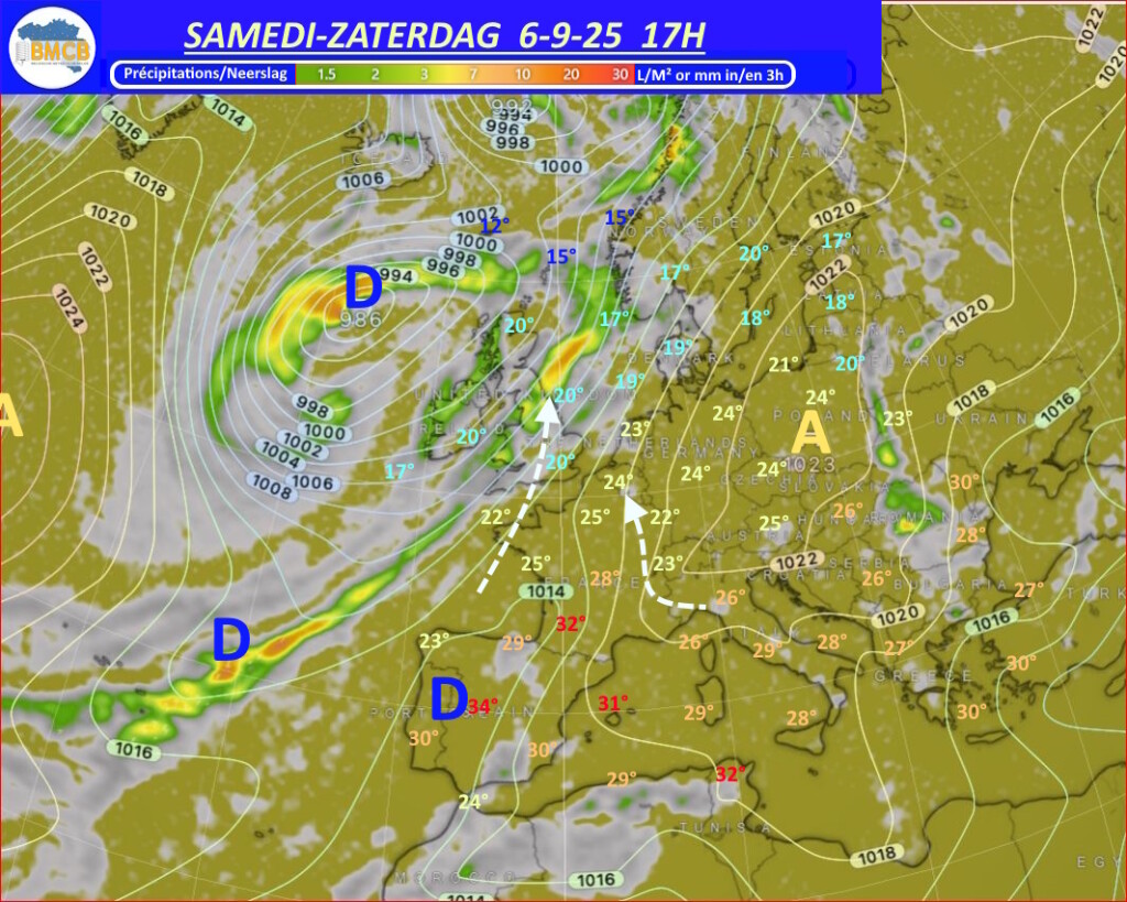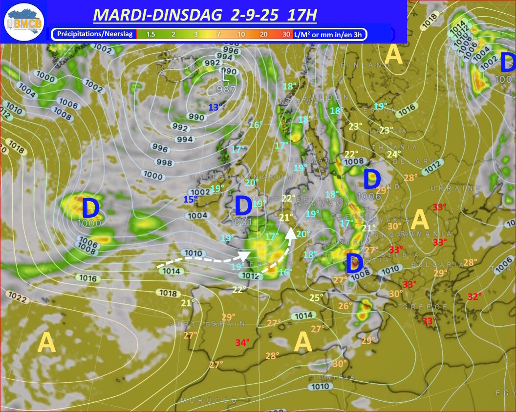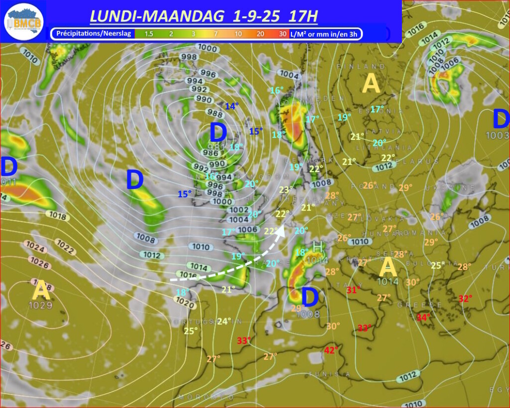 Daarachter volgt een zachte, licht onstabiele zuidwestelijke stroming, waarin zich twee secundaire depressies (~1001 hPa) verplaatsen richting het noordoosten, naar de Britse eilanden, op dinsdag en woensdag.