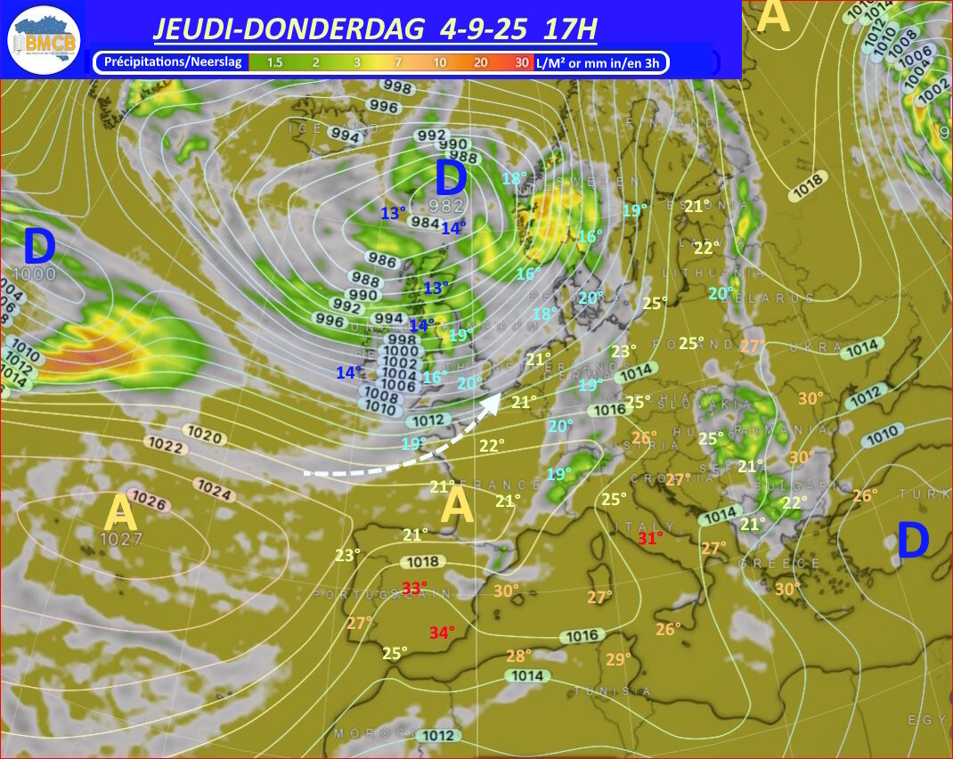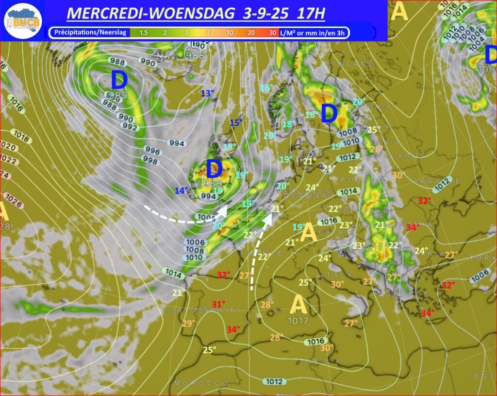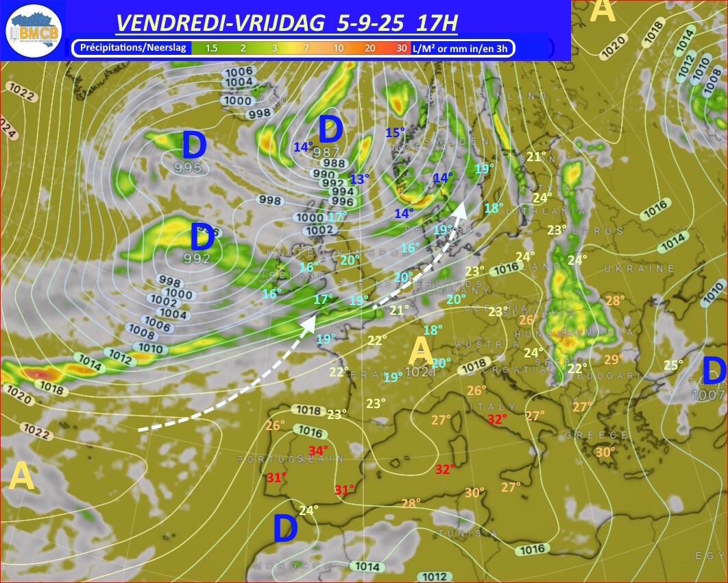 Evolutie van de weekDeze situatie houdt onze regio in een zachte maar wisselvallige stroming, met de passage van meerdere frontale zones, en dit tot het einde van de week.