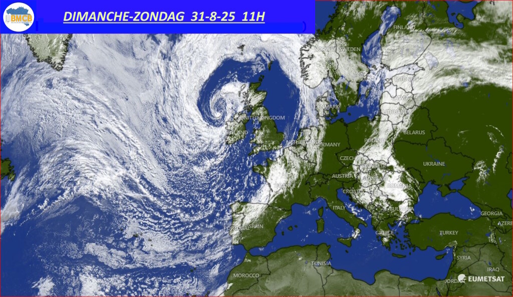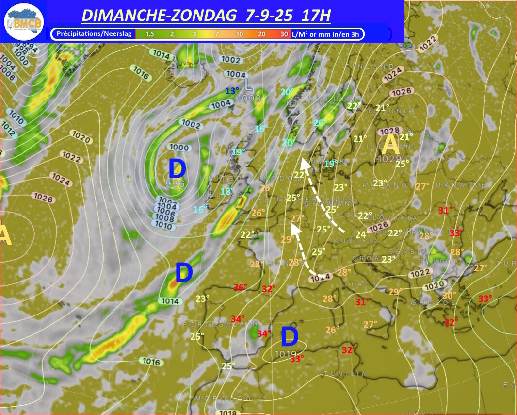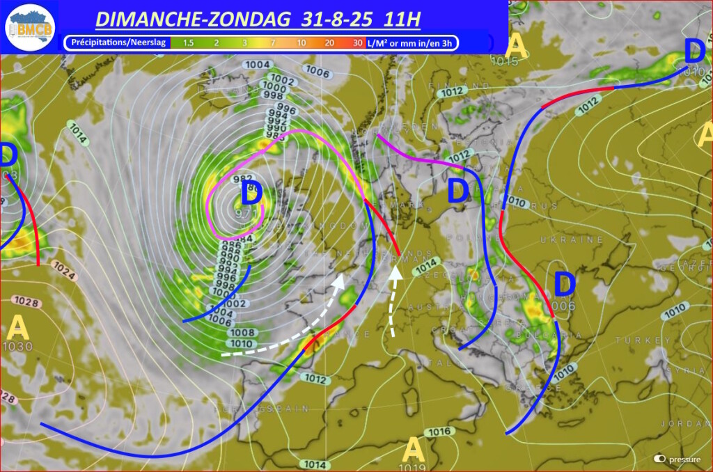 Op zondagmiddag strekt een koufront zich uit van de Benelux tot aan Baskenland, met een golf die zich ontwikkelt boven het zuidwesten van Frankrijk en geleidelijk naar onze regio’s trekt.