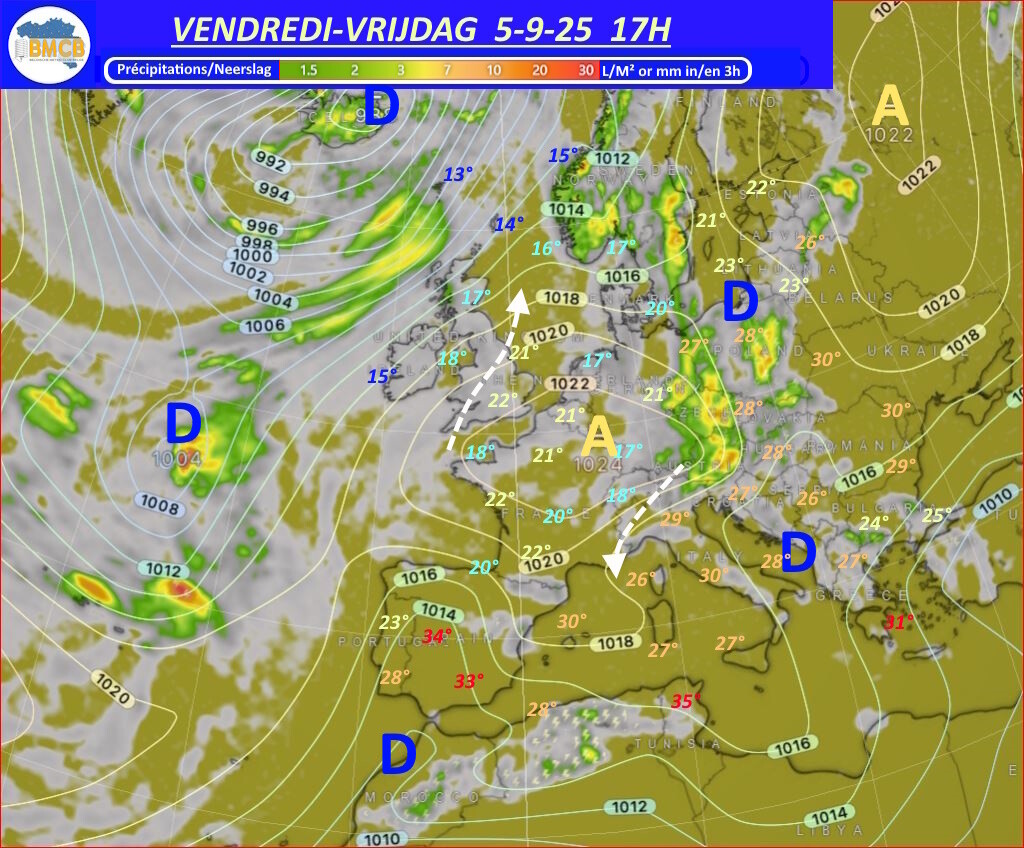 Op donderdag trekt een nieuwe regenzone over het land, gevolgd door een hogedrukopbouw boven Frankrijk, de Benelux en Zuid-Duitsland. Tegen het einde van de week resulteert dit in de vorming van een anticycloon van 1024 hPa boven het noordoosten van Frankrijk.