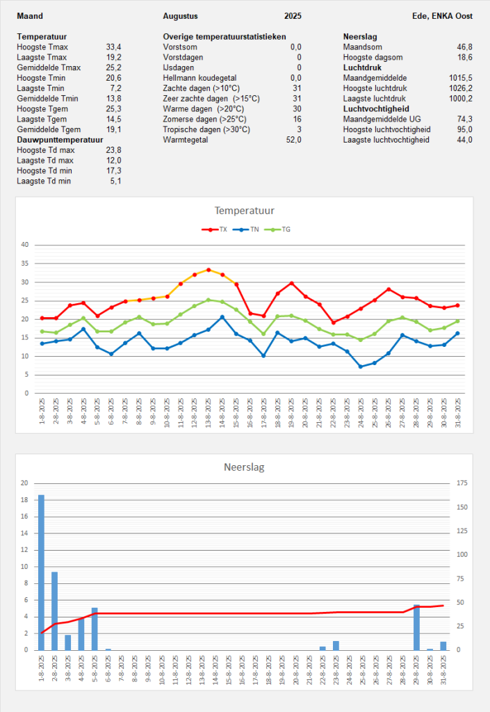 Verder was het een droge en warme maand met alleen op 22 augustus een Tx onder de 20°C. De eerste 5 dagen van augustus en een goed gemikte bui op 29 augustus waren verantwoordelijk voor bijna de gehele neerslagsom.
