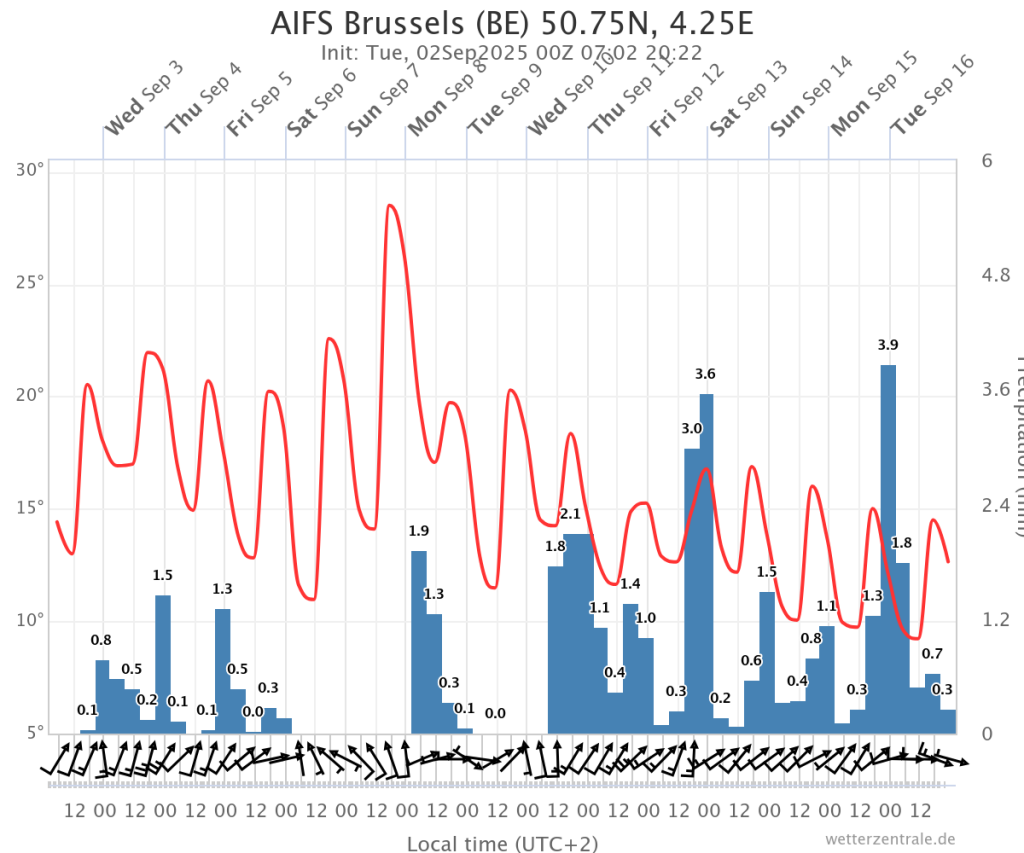 Zelfde beeld, met een kortstondig warmtepiekje op zondag. Onvervalst nazomerweer is bij AIFS voorlopig nog niet aan de orde.