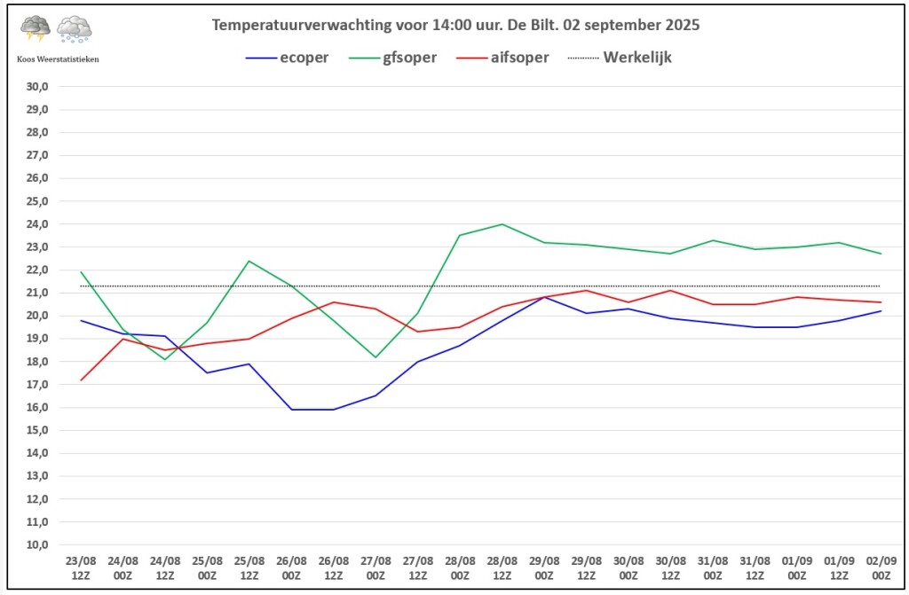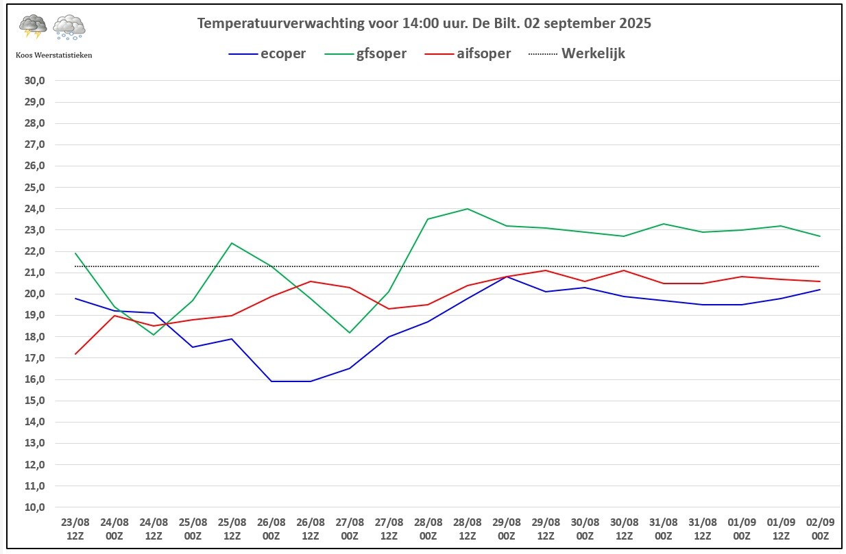 Gemiddelde afwijking zat op 1,9 °C. EC op 2,1 °C en AIFS op 0,8 °C over de laatste 14 opers.