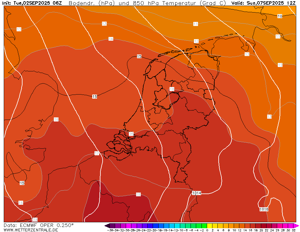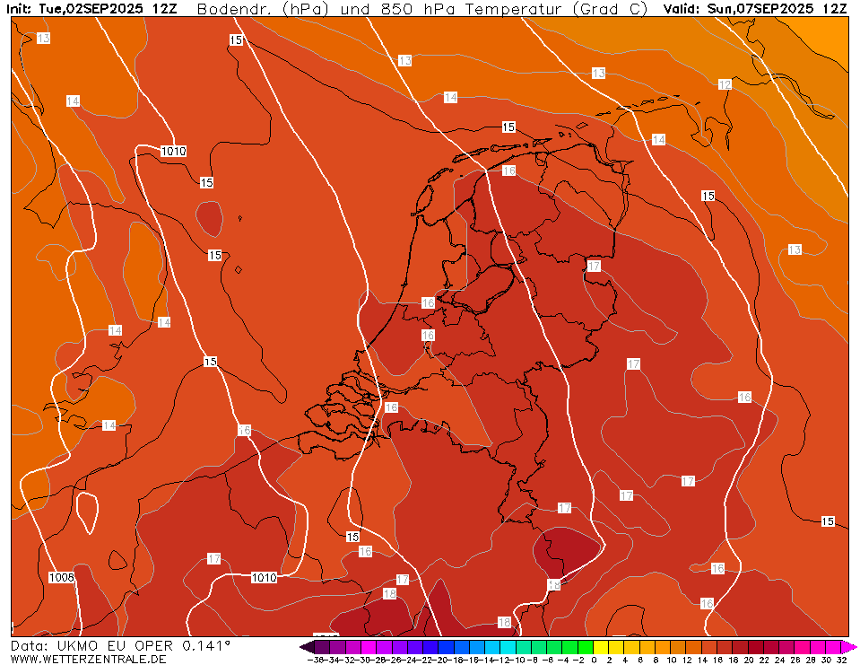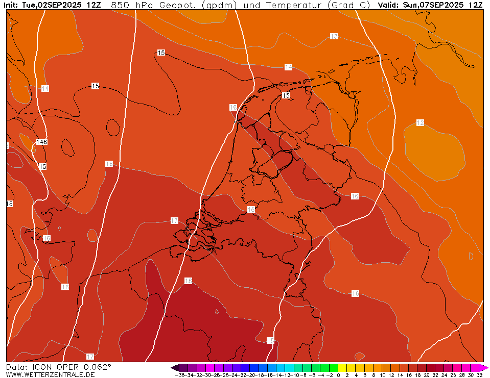 34 graden is waarschijnlijk een paar graden te fanatiek, maar ook EC, UKMO en ICON komen met 16C voor de T850 aanstaande zondag.