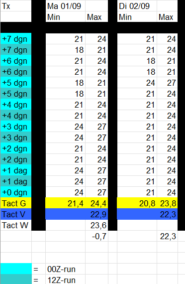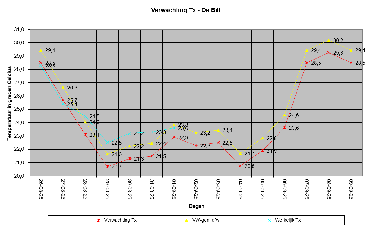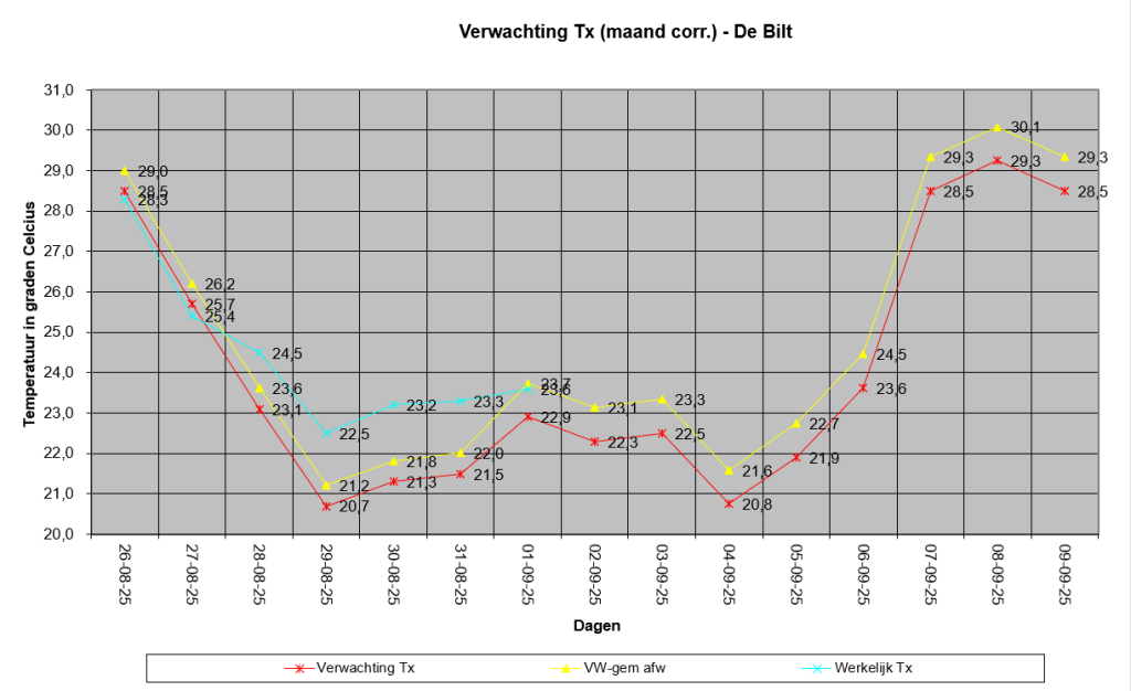 Met de correctie van augustus, kwam de meest waarschijnlijke Tx uit op 23,1°C en laat dat nu net nog een fractie nauwkeuriger zijn ten opzichten van de daadwerkelijk behaalde 22,8° (zie 5e afbeelding).