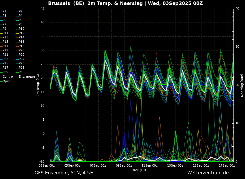 Voor Brussel komt enkel de oper nog aan 30.0°, terwijl dat gisteren