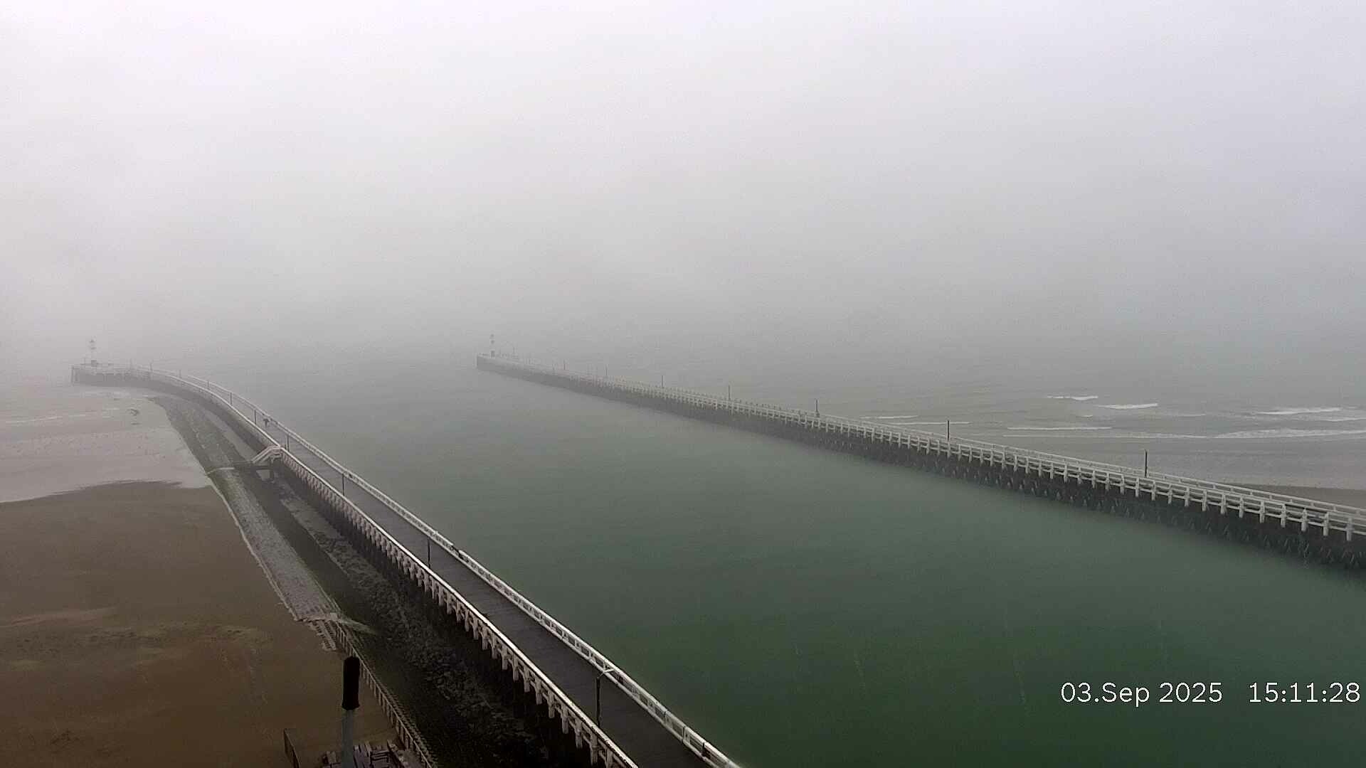 De webcam van Nieuwpoort (Meetnet Vlaamse Banken) toont dan weer sterk verminderde zichtbaarheid door hevige neerslag.