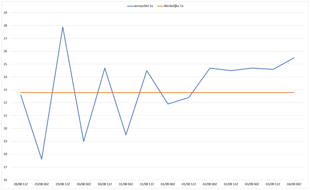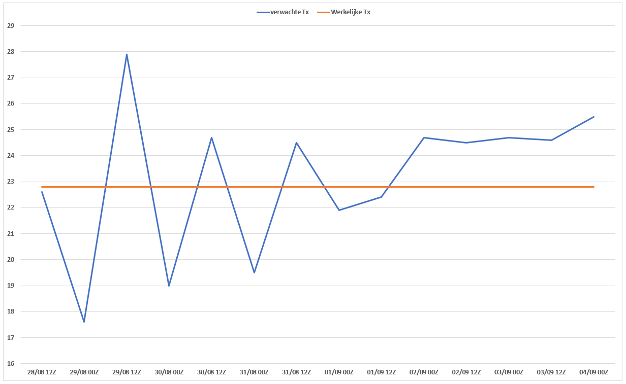 Kijk je naar de laatste 14 opers en pak je de temperatuur van 14:00 uur en telt daar 1,5 °C bij op dan kom je op een gemiddelde Tx van 23,2 °C. Dan lijkt de verwachte Tx 0,4 °C te hoog te liggen voor vandaag.(Tx op dit moment is 22,8 °C)