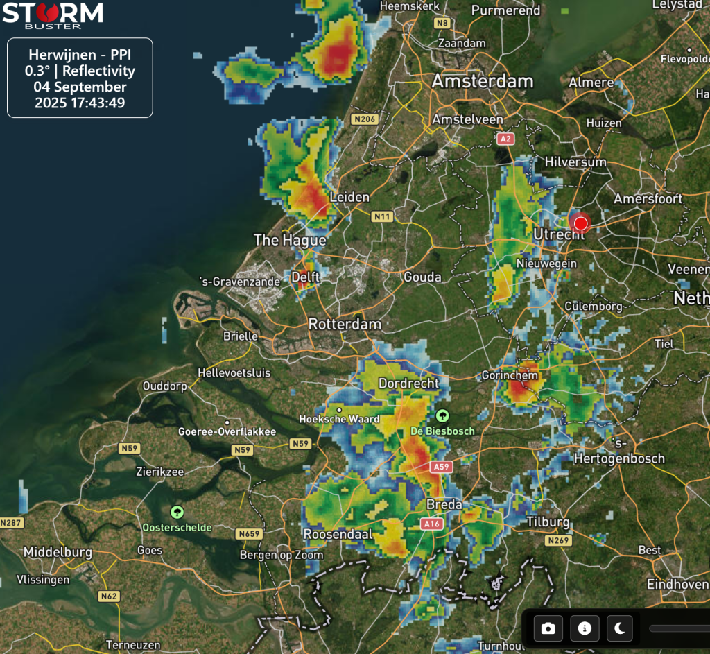 BIj deze hieronder een screenshot van zojuist van StormBuster. Zo te zien houd ik het in De Bilt in het komend uur (zie rode punt door GPS-locatie) waarschijnlijk niet droog