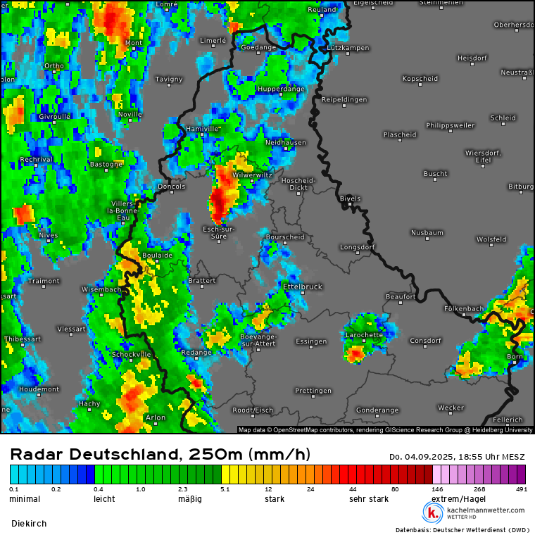 Gelijktijdige afbeeldingen (18:55) van meteo Boulaide en Kachelmannwetter. Het zwaarste zat net ten zuiden van mij.