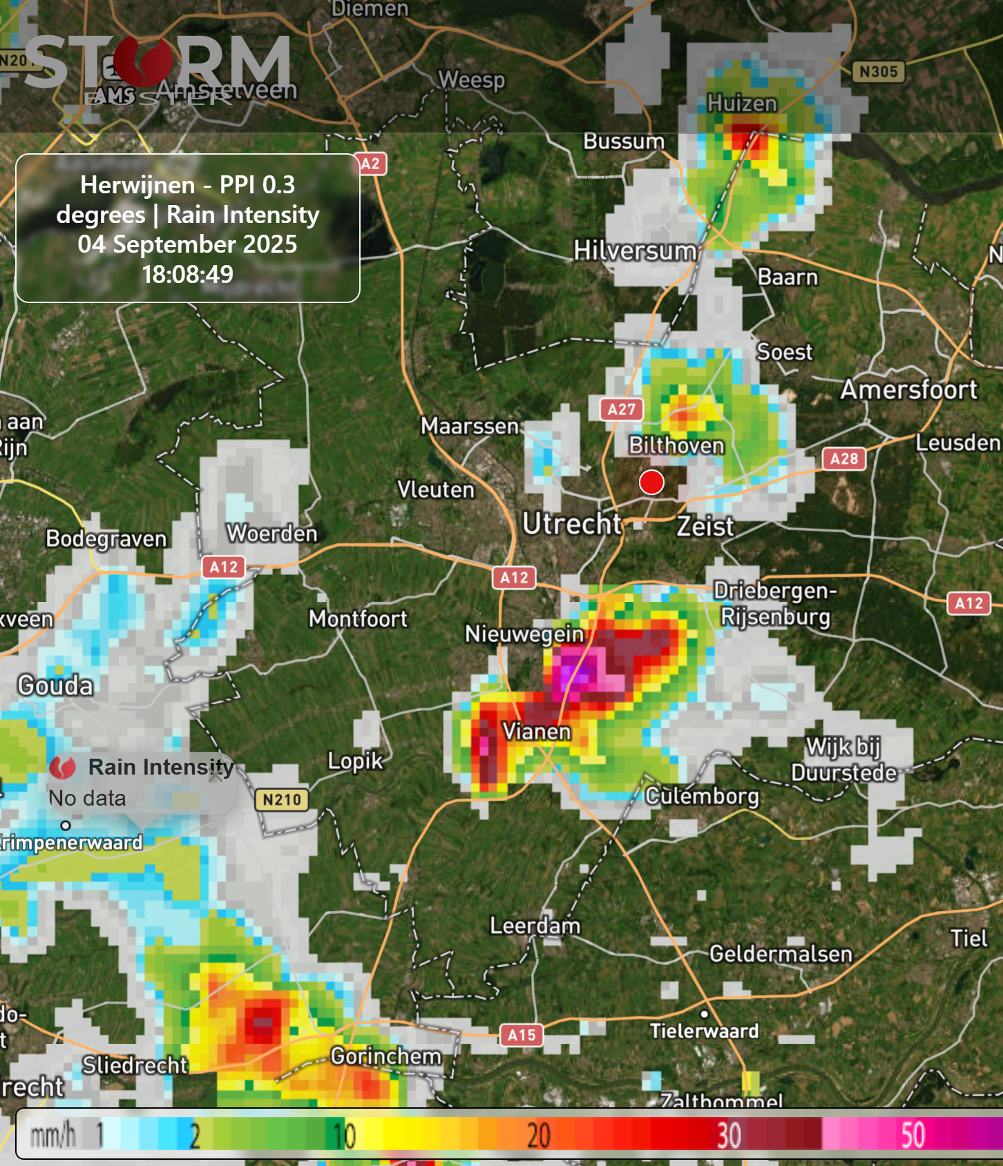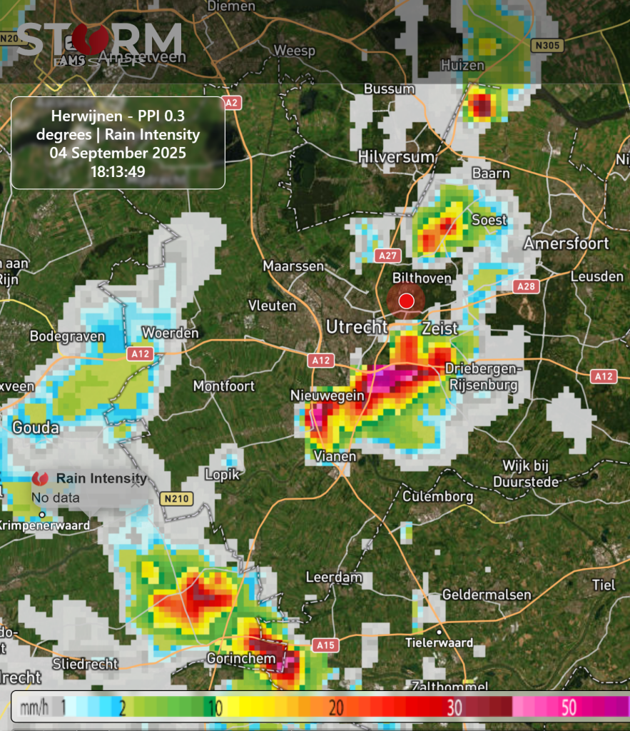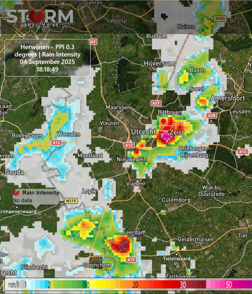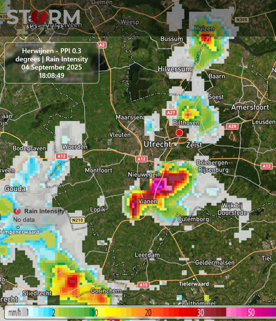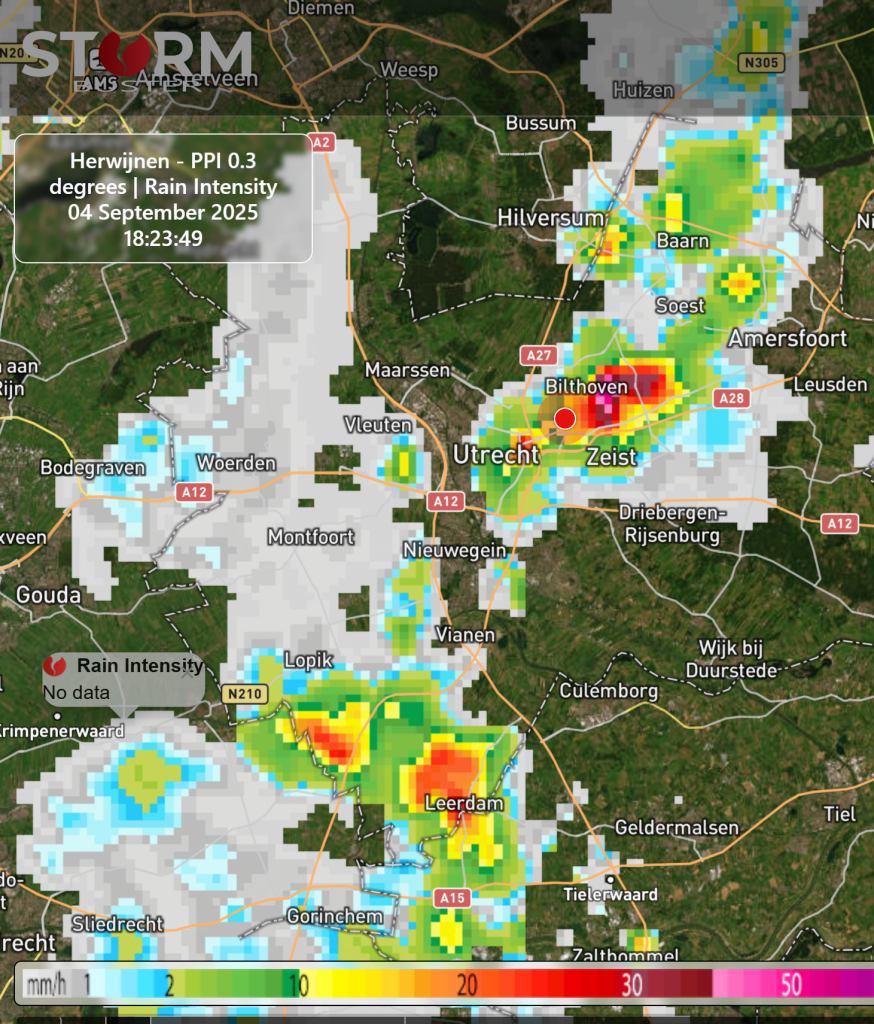 Leek inderdaad een 'leftmover'. Ik zag het vanaf hier op de overloop 'kolken''aan de noordwestzijde van de bui. Tegelijkertijd was er een 'downburst' zichbaar. De neerslag viel zeker met een intensiteit van boven de 40 mm/u, zelfs boven de 50m m/u. De trekrichting was Nieuwegein - Zeist. De zwaarste kern trok hier net ten zuidoostelijk langs, zie ook radarbeelden van StormBuster.