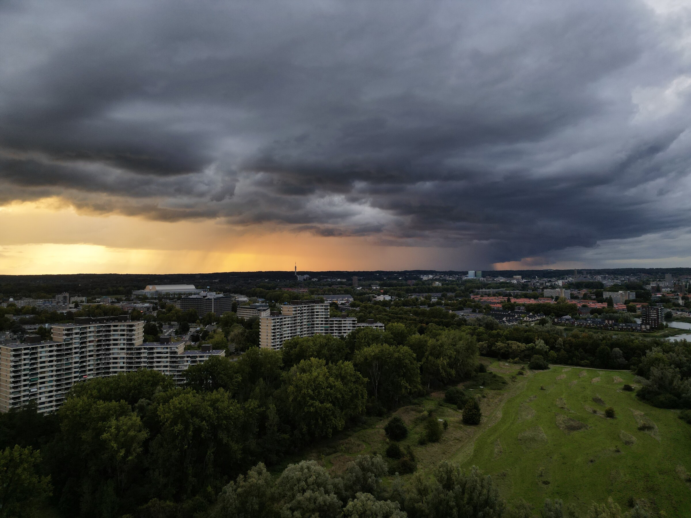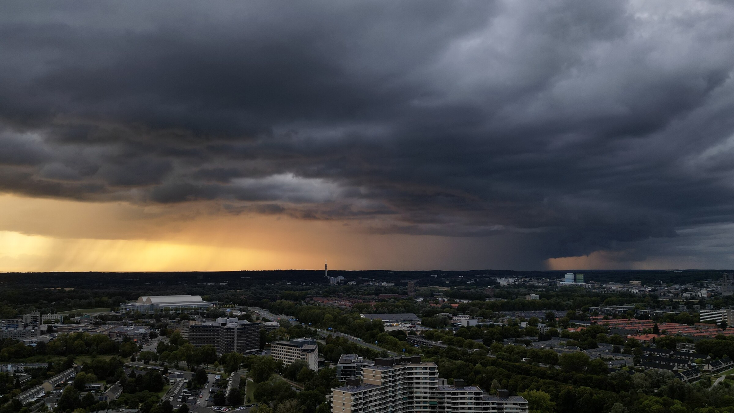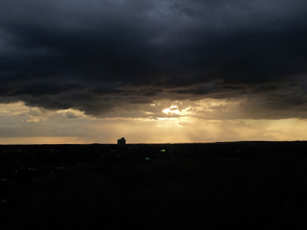 Er trok het afgelopen uur een buienlijntje over onder andere Ede en Wageningen en dat leverde vanuit Arnhem een fotogeniek beeld op! De zon scheen van achter de bui, wat voor een mooie oranje gloed zorgde