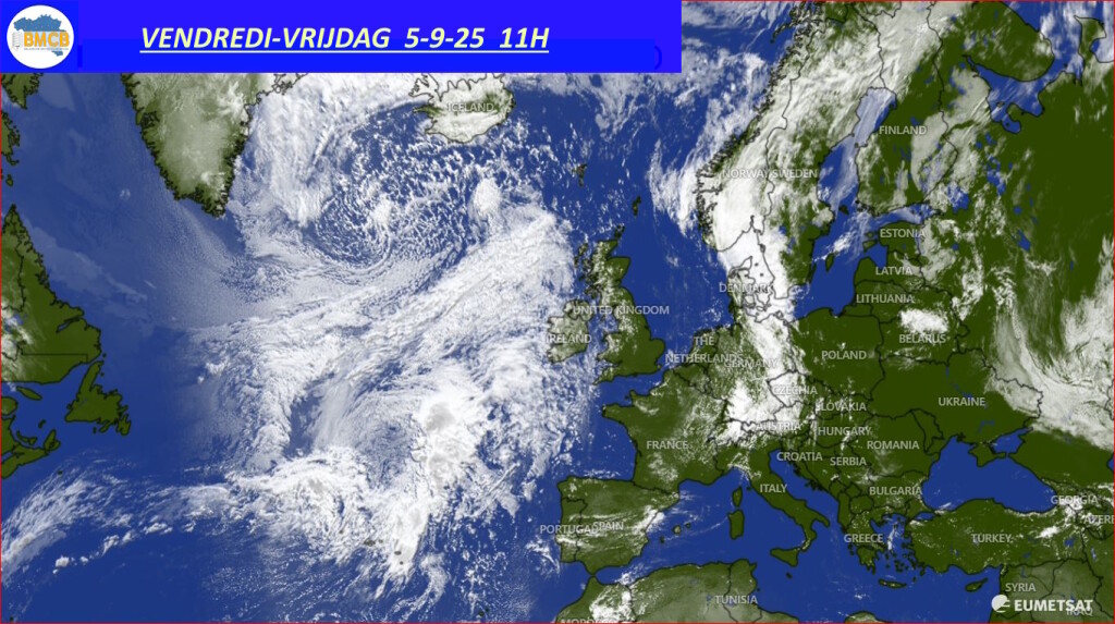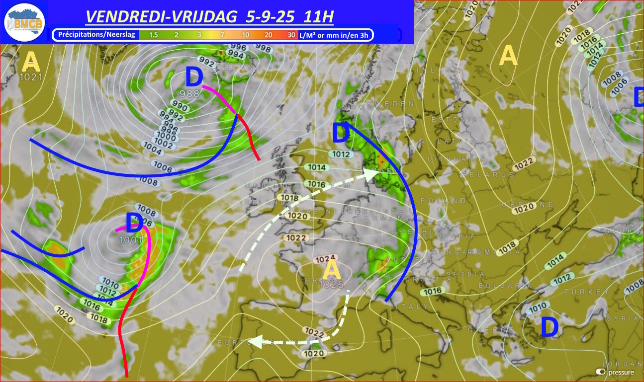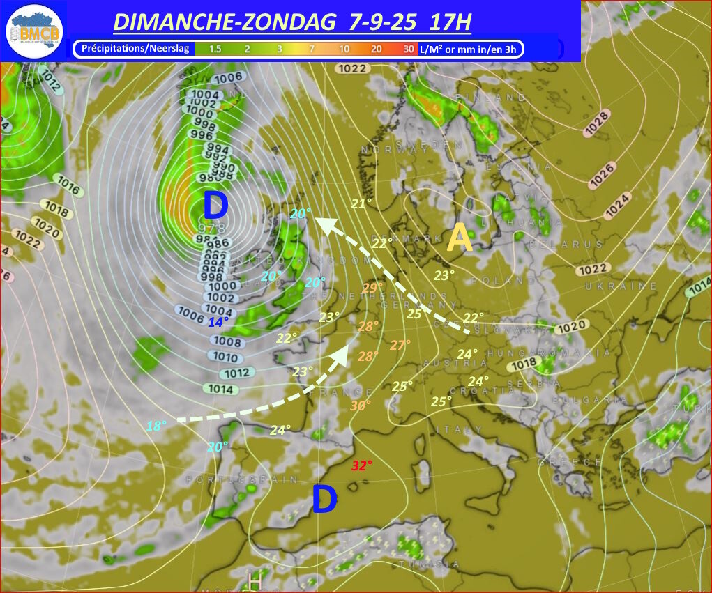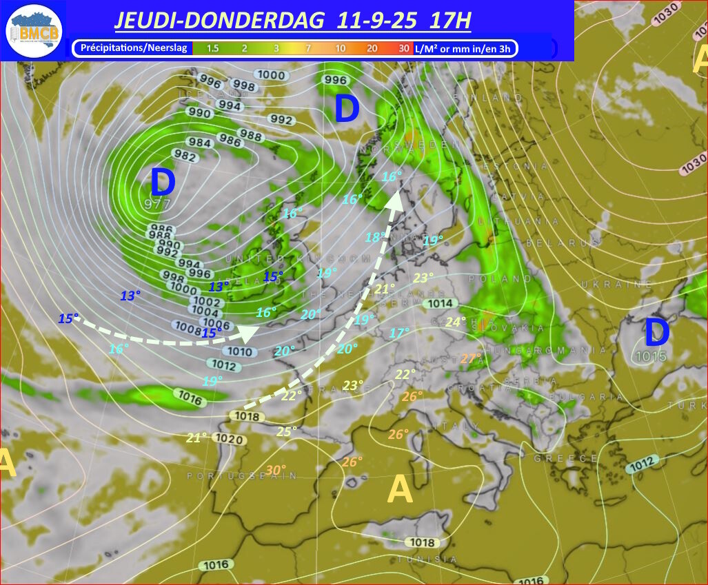 Donderdag volgt een koeler en instabiel oceaanfront, gestuurd naar West-Europa door een diepe depressie van 977 hPa, gecentreerd ten zuiden van IJsland en ten noordwesten van de Britse eilanden.