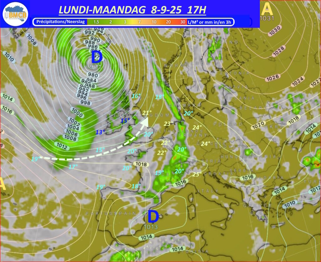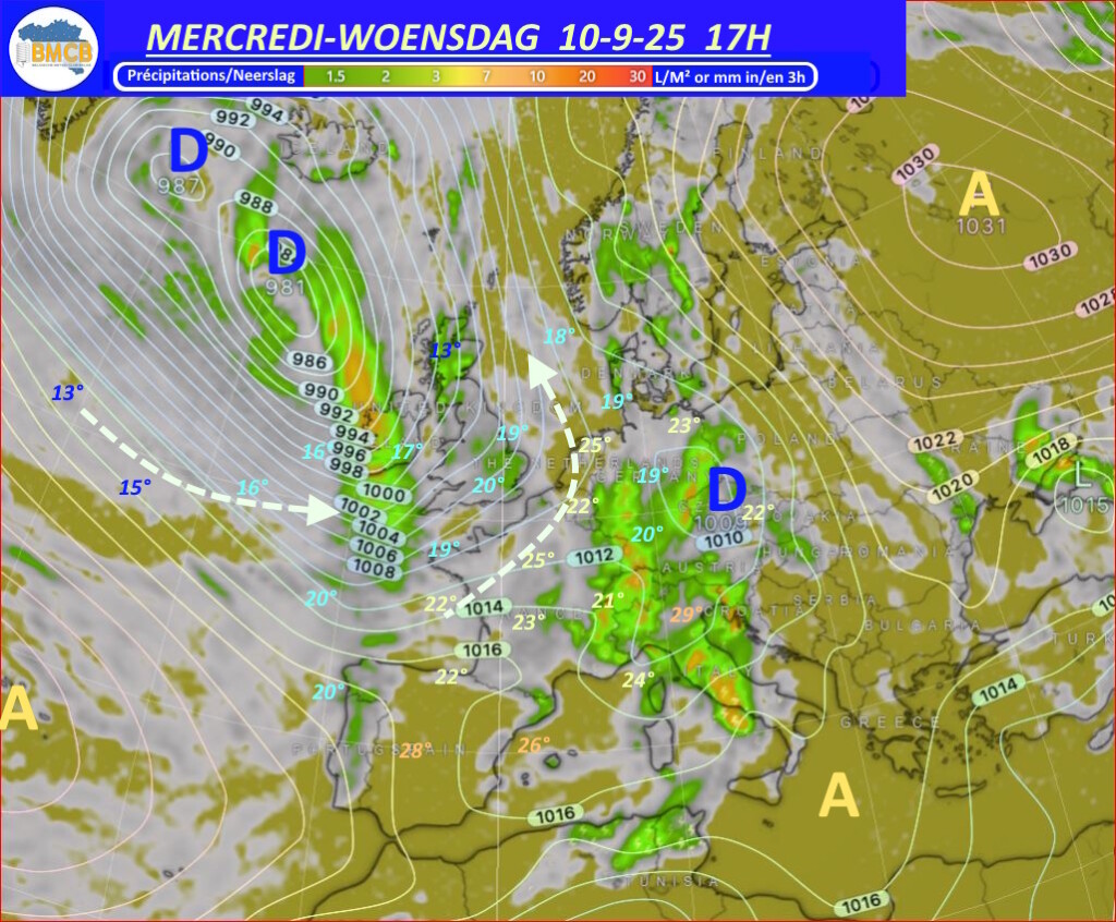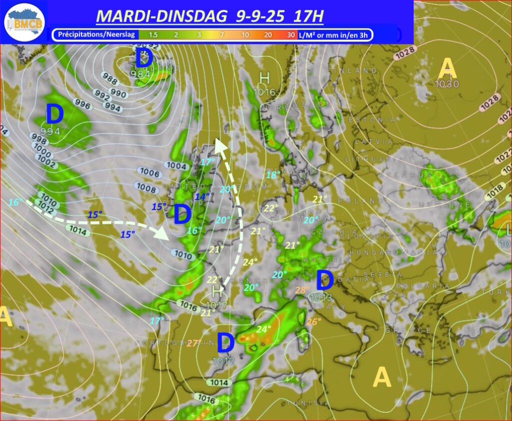 Dinsdag breidt de oceaandepressie zich uit naar Ierland met een kern van 1006 hPa die snel naar het noordoosten trekt, waardoor onze regio's tot woensdag onder een zachte zuidstroming blijven, voordat er 's nachts een nieuw koufront arriveert.