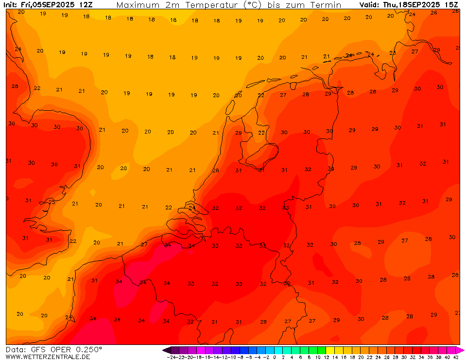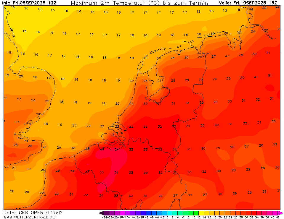 Voor vandaag zaten de laatste 14 opers gemiddeld 2,5 °C te hoog.