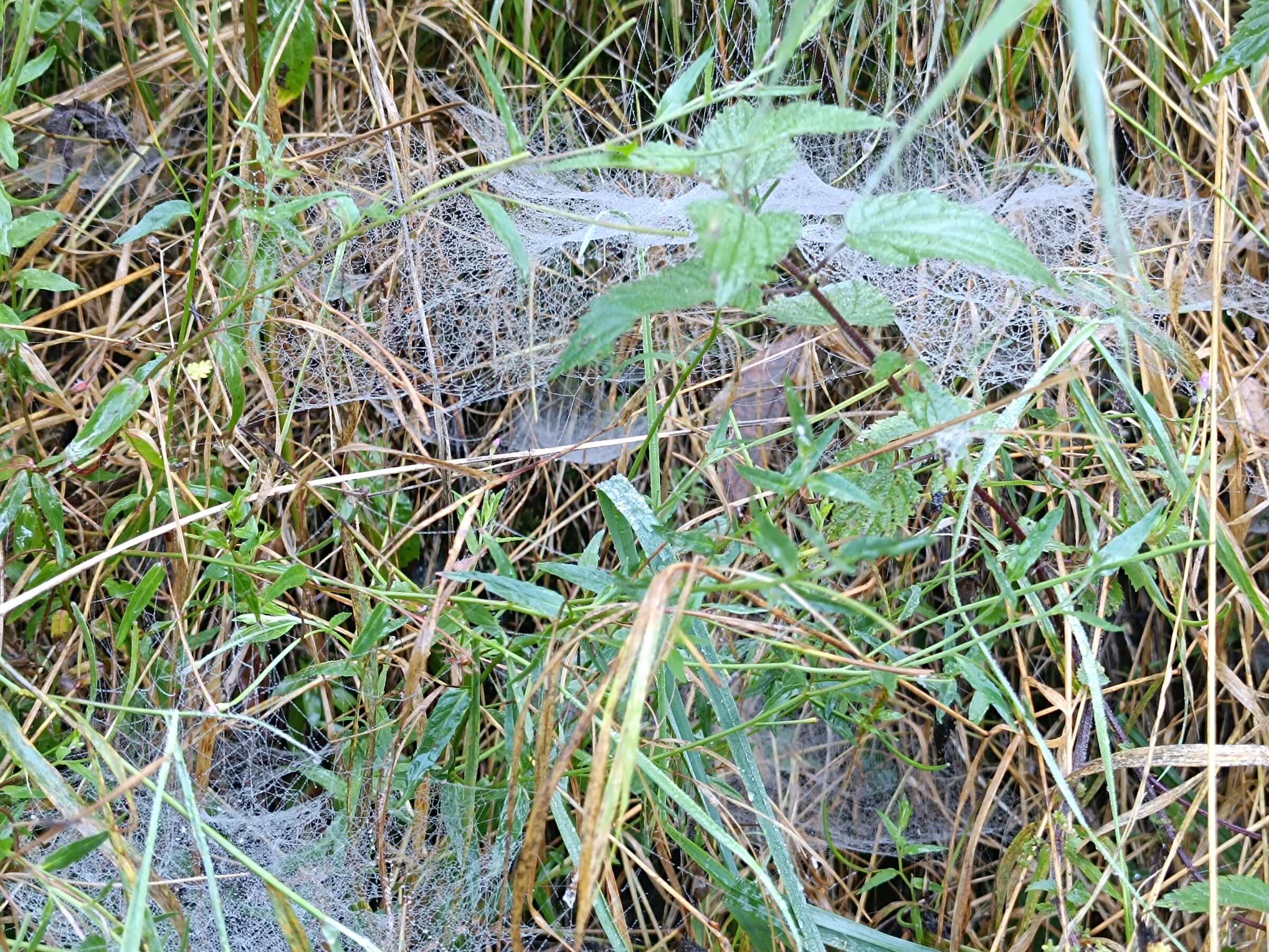 Een stukje verderop zitten op meerdere plaatsen heel wat horizontale spinnewebben bij elkaar. Die zijn nu bij de hoogste zonnestand nog steeds nat van de zware mist van afgelopen nacht.
