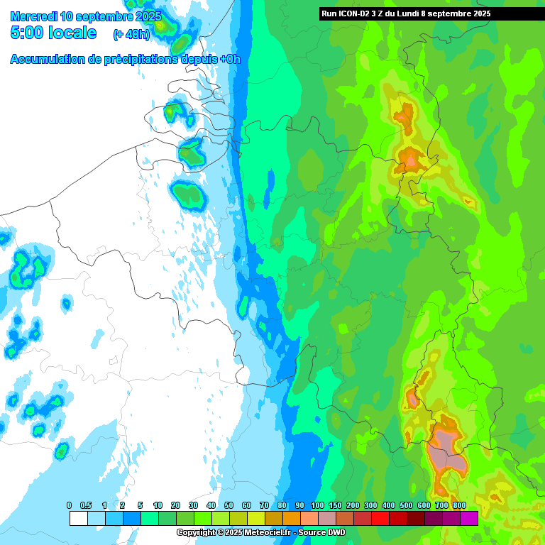 ICON-D2 03Z geeft iets minder, maar toch ook 100+ mm in het zuiden van Luxemburg, en 80+ mm in delen van Nederlands Limburg.