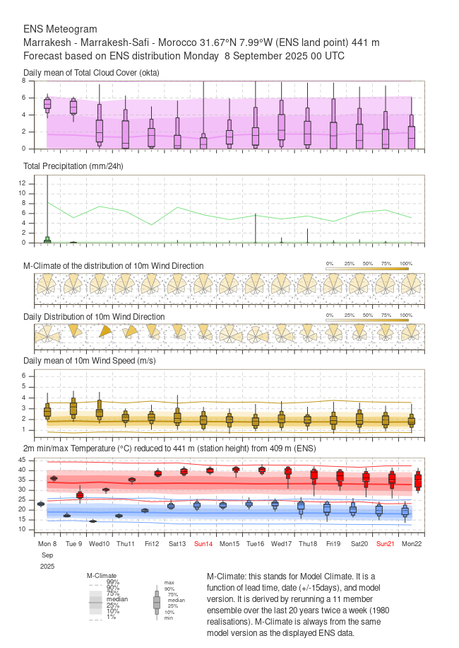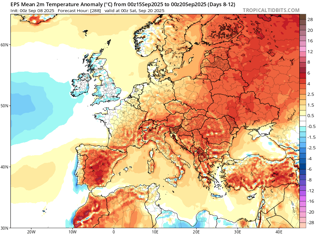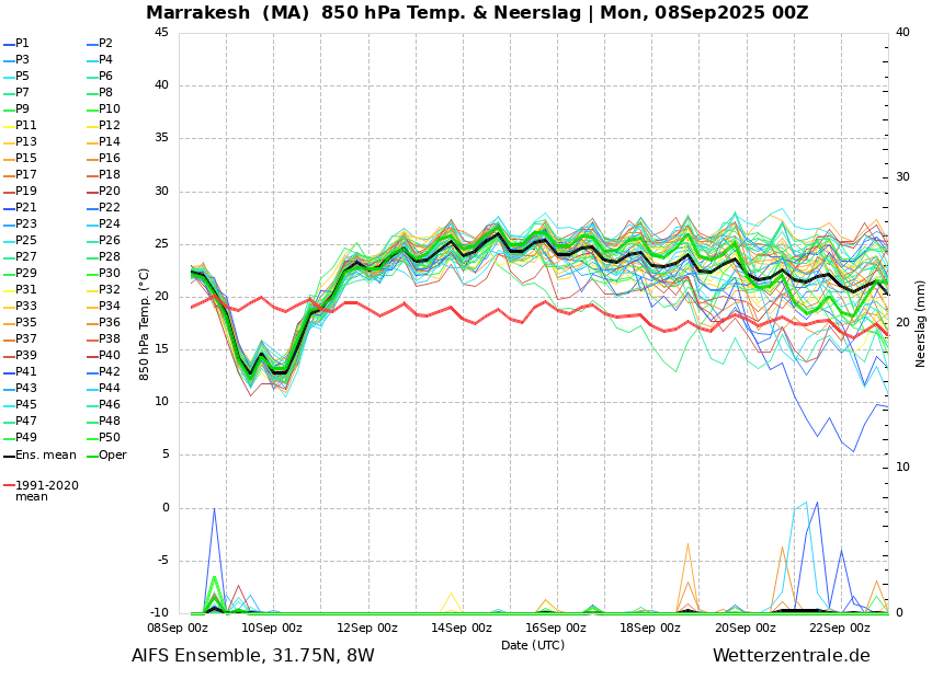 Temperaturen eind v/d week en de week erna waarschijnlijk ver boven de doorgaans al hoge norm. Maximumtemperaturen volgens het EPS iets boven de 40 graden, tegenover een langjarig gemiddelde van 33 à 34 graden voor half september.