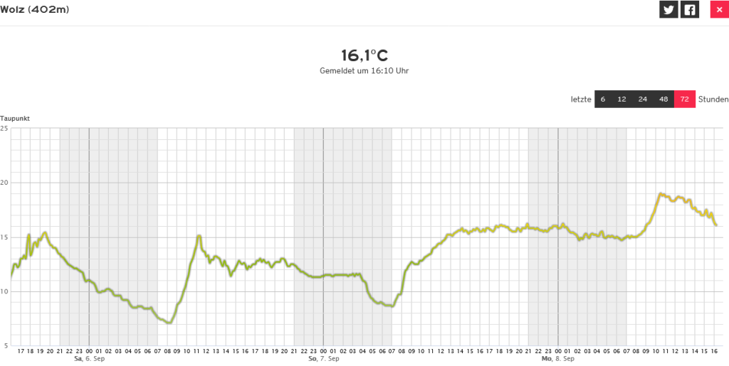 De afgelopen nacht werd het bewolkt, zodat temperatuur en dauwpunt niet verder daalden dan tot rond de 15°C. Maar vanochtend ging het dauwpunt eerst nog weer omhoog naar 19 graden, wat bij dit rustige septemberweer toch wel uitzonderlijk lijkt. Misschien een voorbode van de komende nacht?